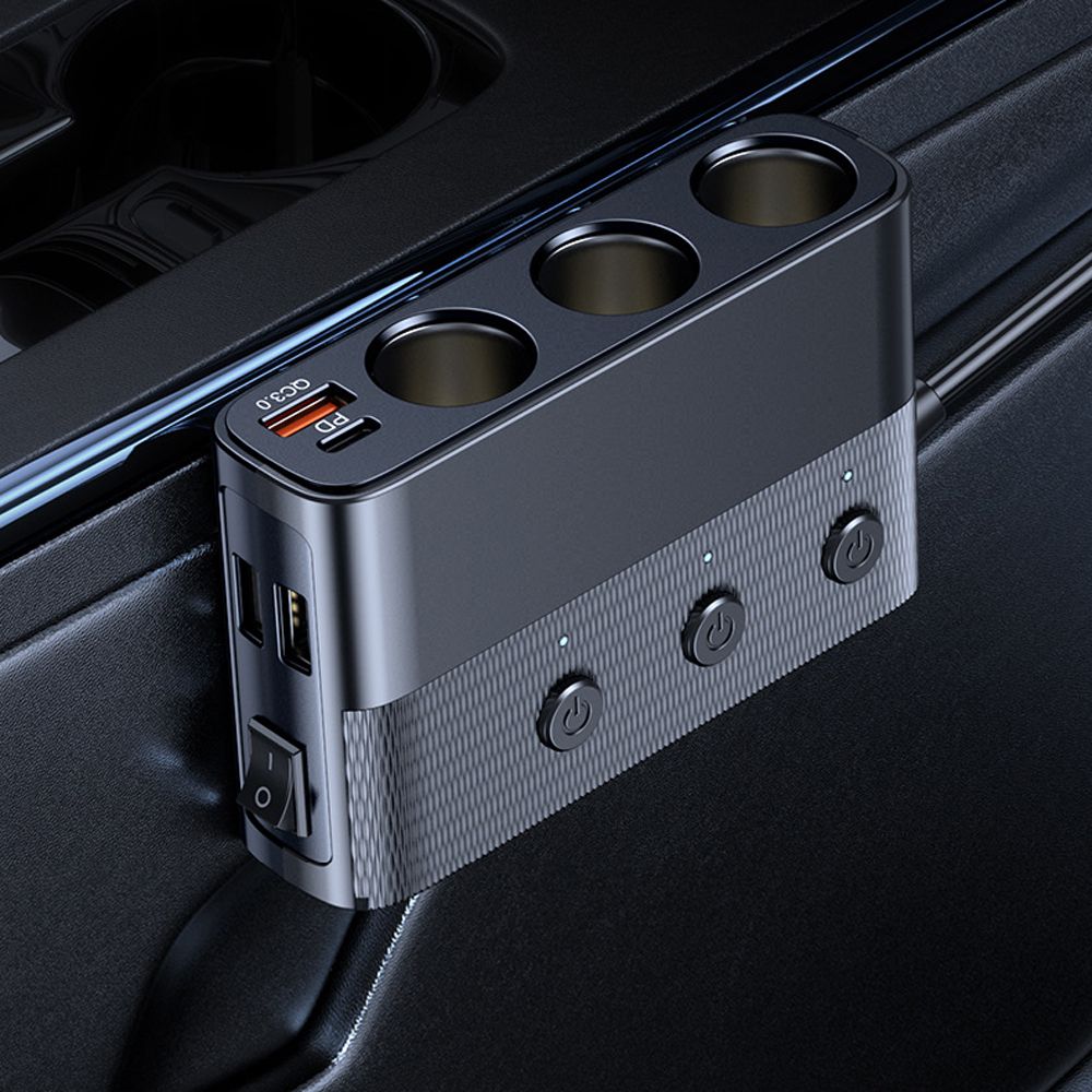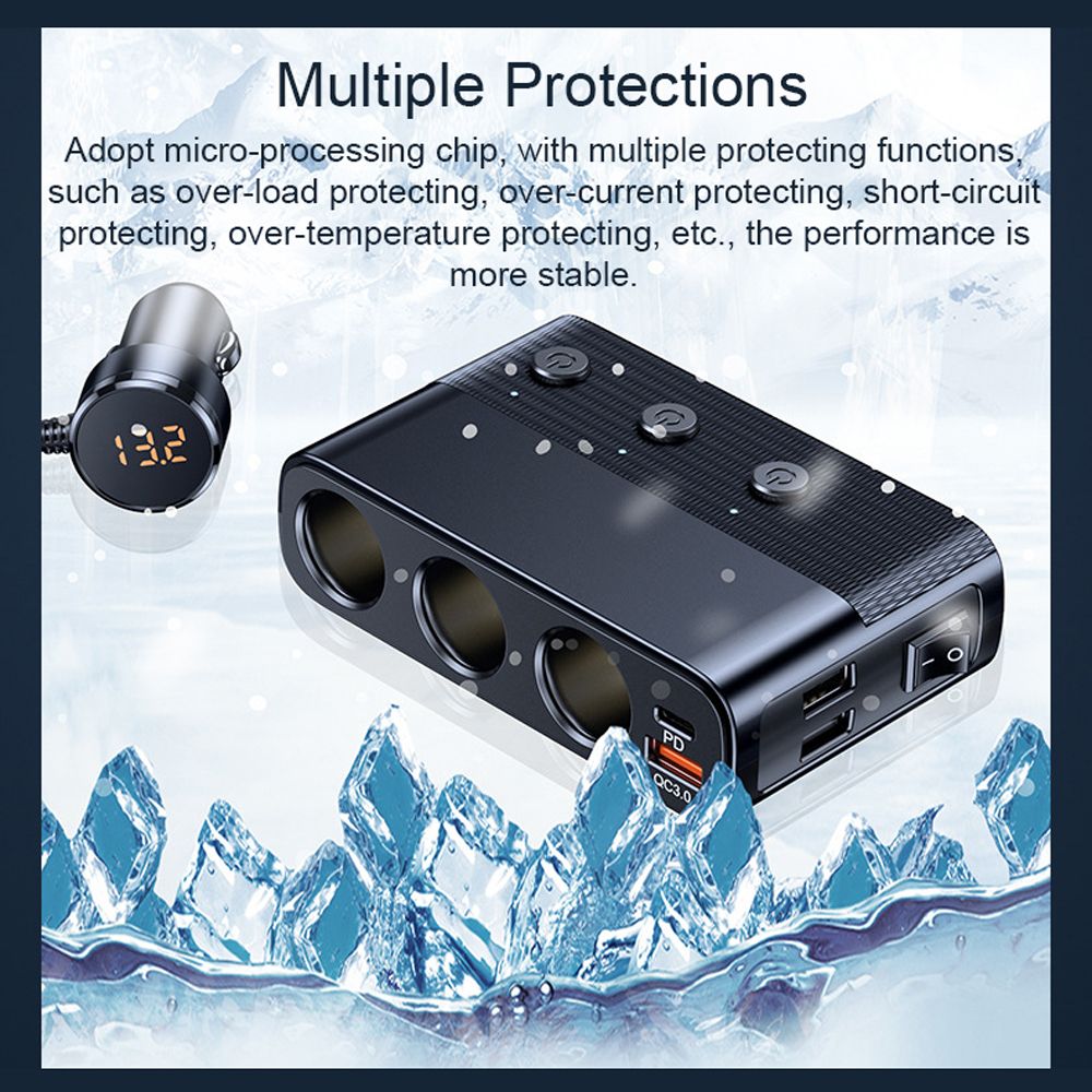 Multi-function car charging adapter provides convenience for you to use multiple devices in the car. It is compact and does not take up space, with multiple protections functions, making it safer to use.