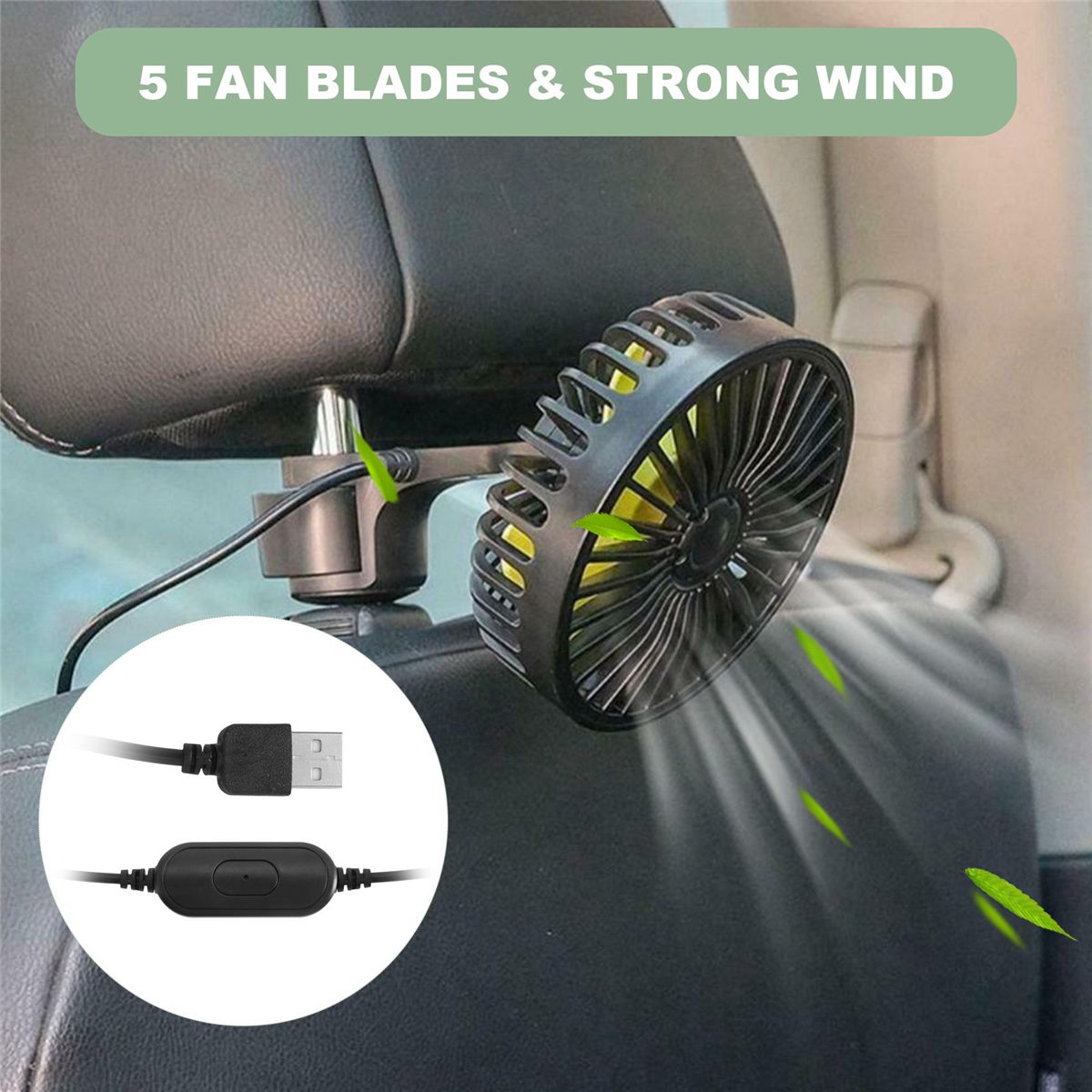 USB Powered Car Fan The fan comes with a USB cable(135cm). USB cable is long enough to set wherever you want to provide coolness for people in the back seat.You can power the fan by USB interfaces such as car charger and power banks.