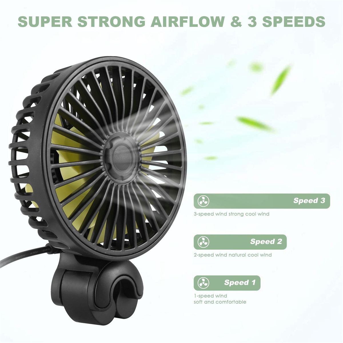 Widely Use This car fan with high quality material adopt a big adjustable clamp design, suitable for various places,great for office desk, baby stroller, car backseat, bicycle, camping tent, home, kitchen, dormitory, library, gym exercising, outdoors/indoors activities. It is very convenient and is great for an idea gift for friends, colleague and family trip.