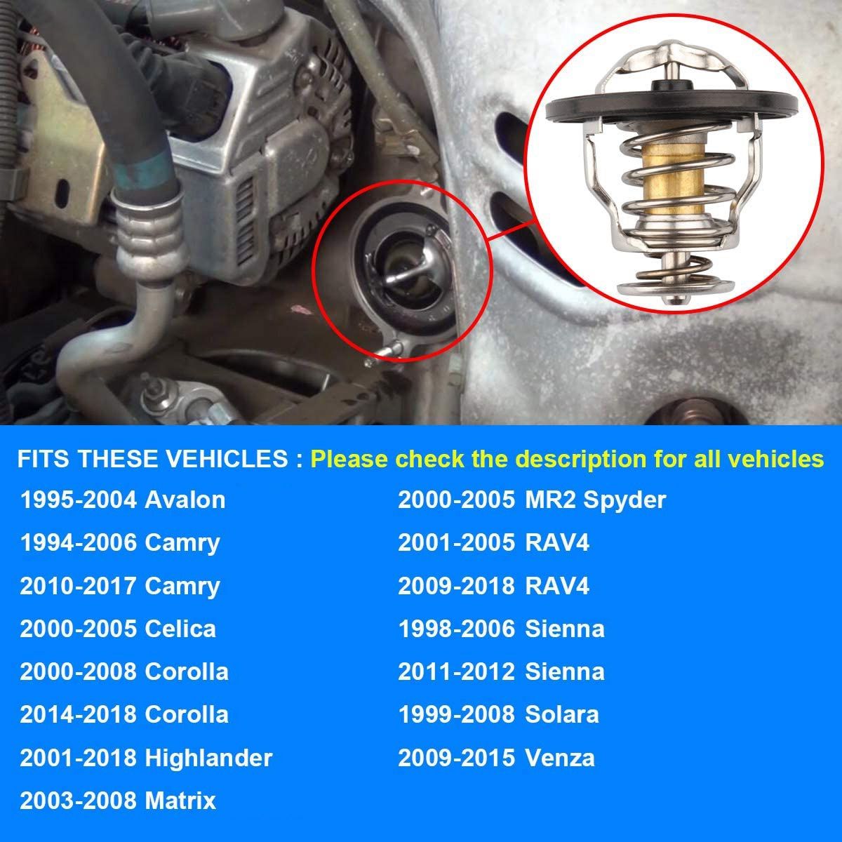 Compatible with for Toyota vehicles: 1995-2004 Avalon - 1994-2006, 2010-2017 Camry - 2000-2005 Celica - 2000-2009, 2014-2019 Corolla - 2000-2005 Echo - 2001 2019 Highlander - 2003-2009 Matrix - 2000-2005 MR2 Spyder - 2001-2005, 2009-2018 RAV4 - 1998-2006, 2011-2012 Sienna - 1999-2000 Sienna - 1999-2008 Solara - 1993-1998 Supra - 2009-2015 Venza - 1993 -1998 Supra thermostat.