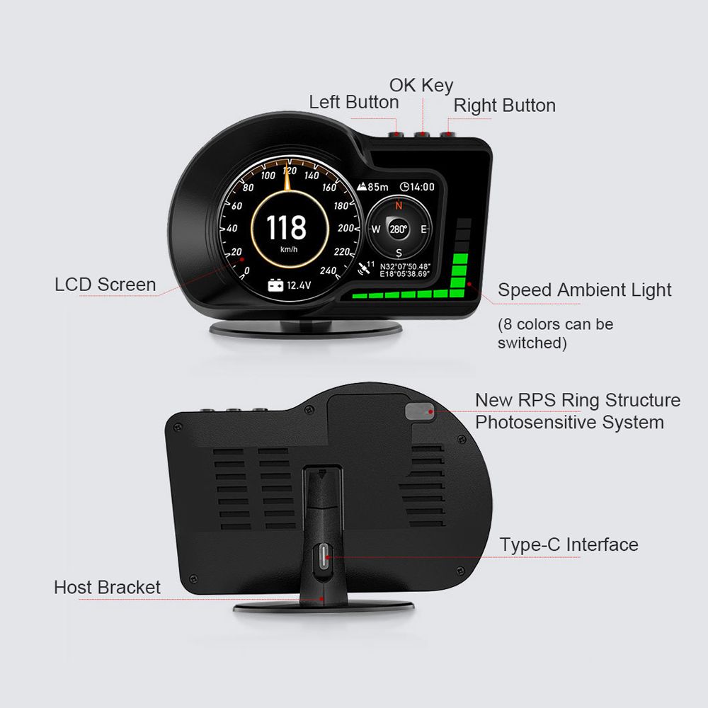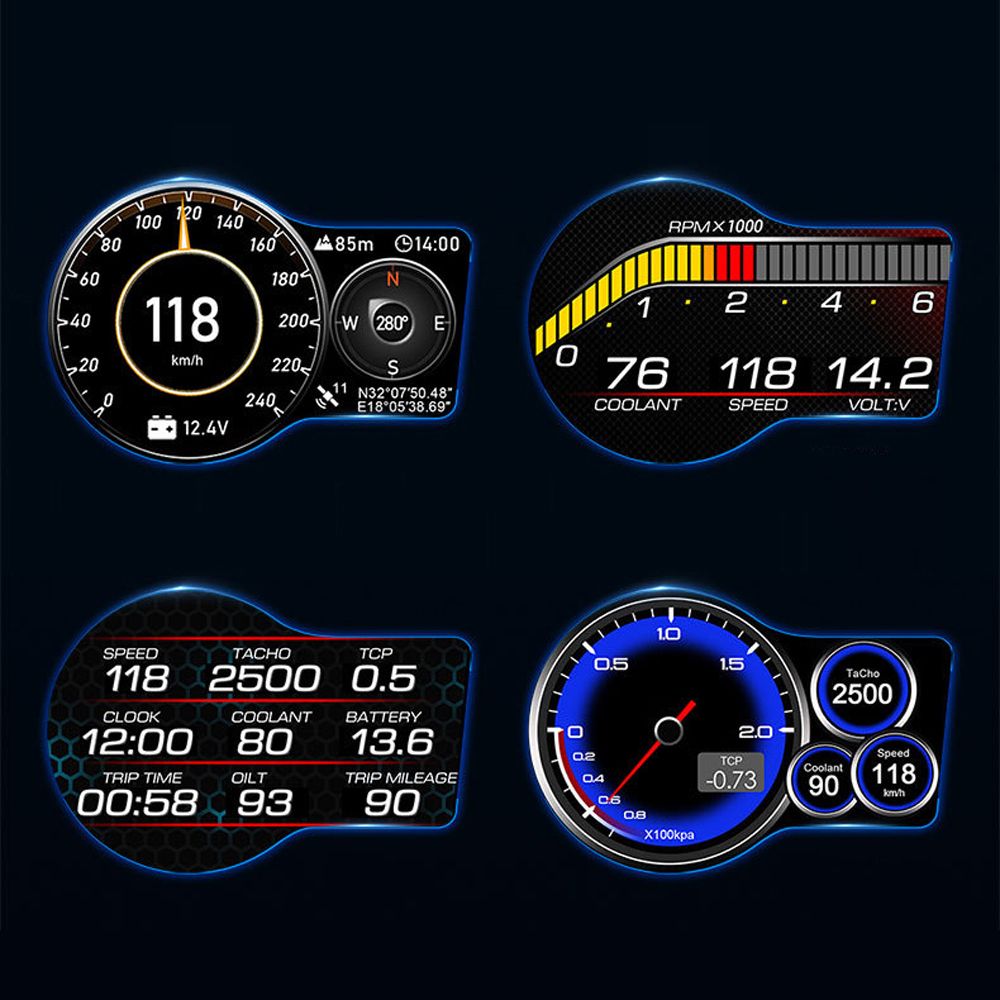 Car headup display shows a variety of data in real time, speed, clock, RPM, voltage, water temperature, driving time, driving distance, satellites quantity, altitude, azimuth, latitude and longitude, oil temperature, acceleration test, brake test, turbopressure, engine load, etc..