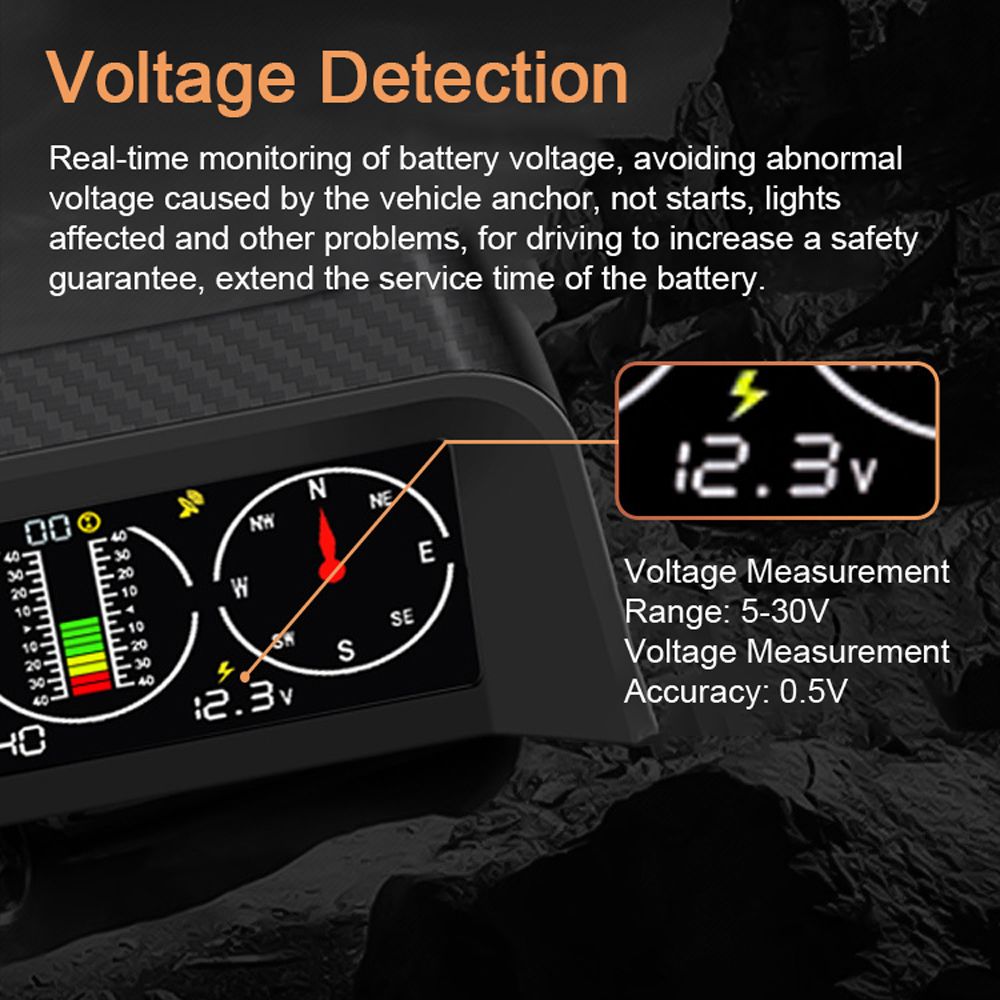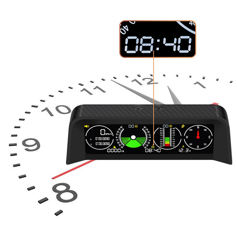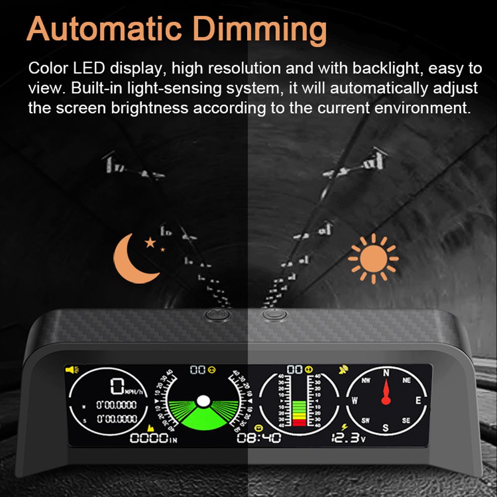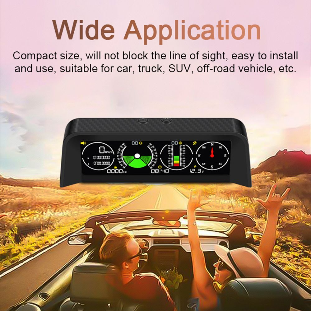 Horizontal Slope Balancer: Support horizontal roll angle and pitch angle monitoring, accurately display the number of uphill/downhill degrees and left/right slope angle, timely warning to ensure smooth driving.