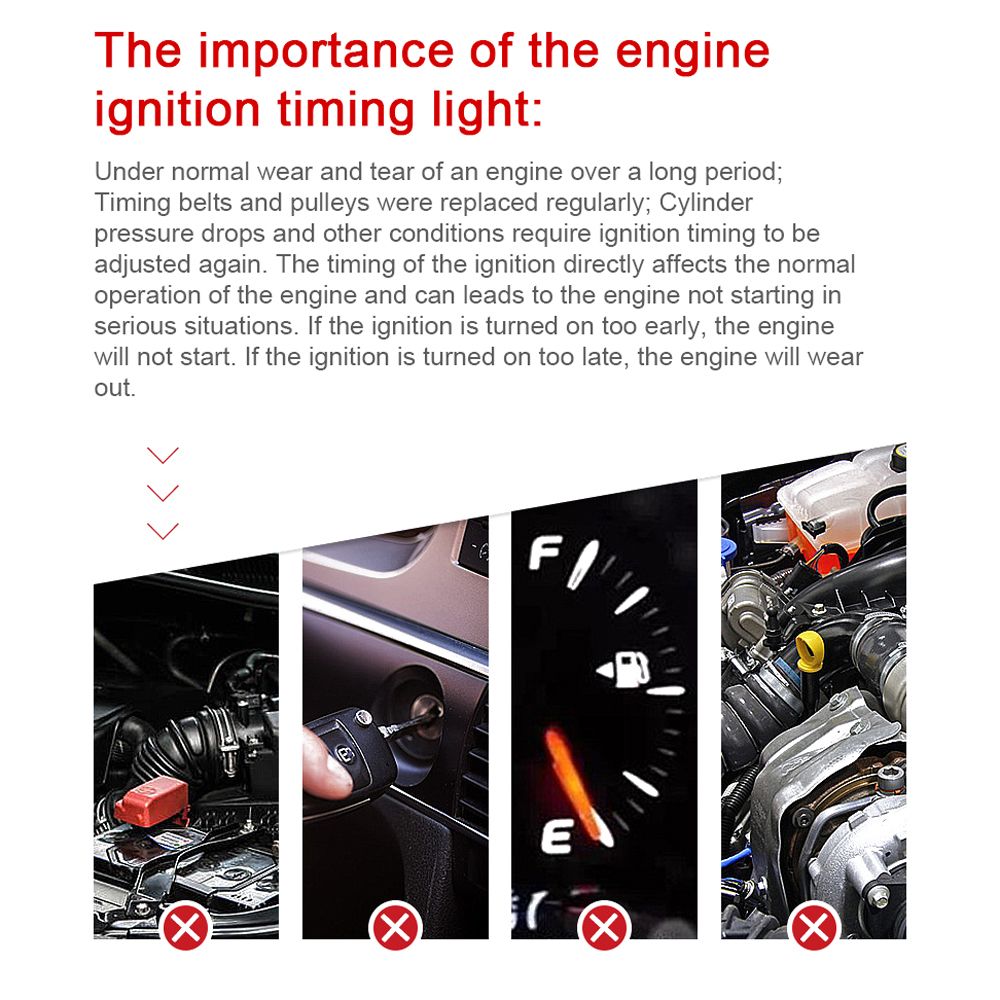 The importance of the engine ignition timing light: Under normal wear and tear of an engine over a long period; Timing belts and pulleys were replaced regularly; Cylinder pressure drops and other conditions require ignition timing to be adjusted again. The timing of the ignition directly affects the normal operation of the engine and can leads to the engine not starting in serious situations. If the ignition is turned on too early, the engine will not start. If the ignition is turned on too late, the engine will wear out.