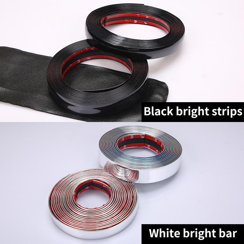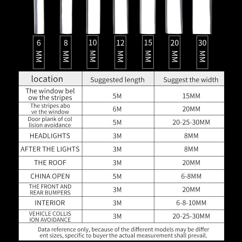 The item is thicker in the middle and thinner on 2 sides , the middle thickne is approximately 2 mmInstallation Method1. Thoroughly clean the p where the car body needs to be pasted. If there is oil or wax, wipe it off with .2. After tearing off the protective film on the back of the bright strip, stick it carefully, and then subtract the exce.3. If the temperature is under 20℃, it's suggest that you heat the back tape by using hair dryer, so as to improve the stickne.4. For make sure the item stick securely, please do not wash the car within 2 day after installation.Size Recommendation: (Only for reference, the precise size please measure your car for confirm)Front window---length: 3-3.2m, width 2cmRear window---length: 2.8m-3m, width 2cmRearview mirror---length: 0.3m, width 1cmDoor side---length: 1m, width 1cmUpper light eyebrow---length: 1m, width 1cmLower light eyebrow---length: 1m, width 1.5cmFour corners---length: 2m, width 1-2cmFront car circumference---length: 2.6m-3m, width 1-2cmRear car circumference---length: 2.8m-3.2m, width 1.5-2cm
