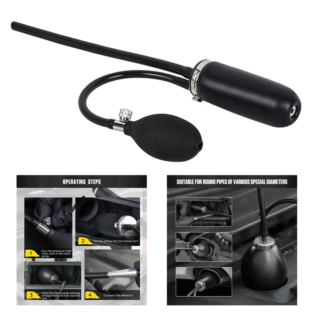 Product Type: Car Smoke Machine Easy Intake Adapter Intake Bladder.Material: Made of high quality rubber, durable.Easy installation: High reliability and high performance.Product Size: 12.5cmx4cm/4.92inchx1.57inch.Package Includes:1Set Smoke Leak Tester.