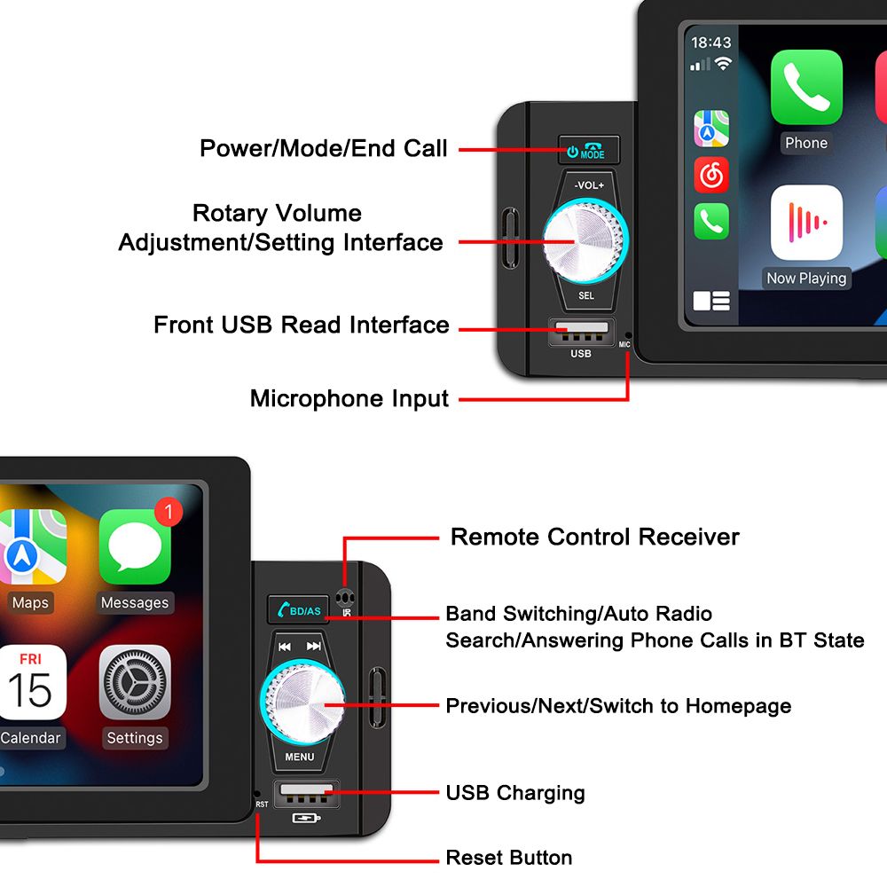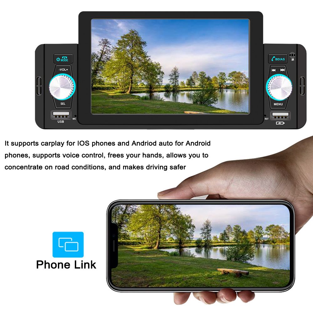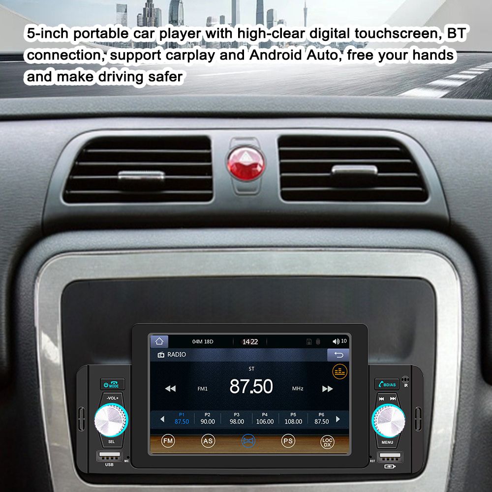 5-inch portable car player with high-clear digital touchscreen, bluetooth connection, support carplay and Android Auto, support Hands-Free Calling,USB Charge,Playback Phone,Reversing Assist Steering Wheel Control,free your hands and make driving safer. Reversing assist is supported to help you park your car in the right place.