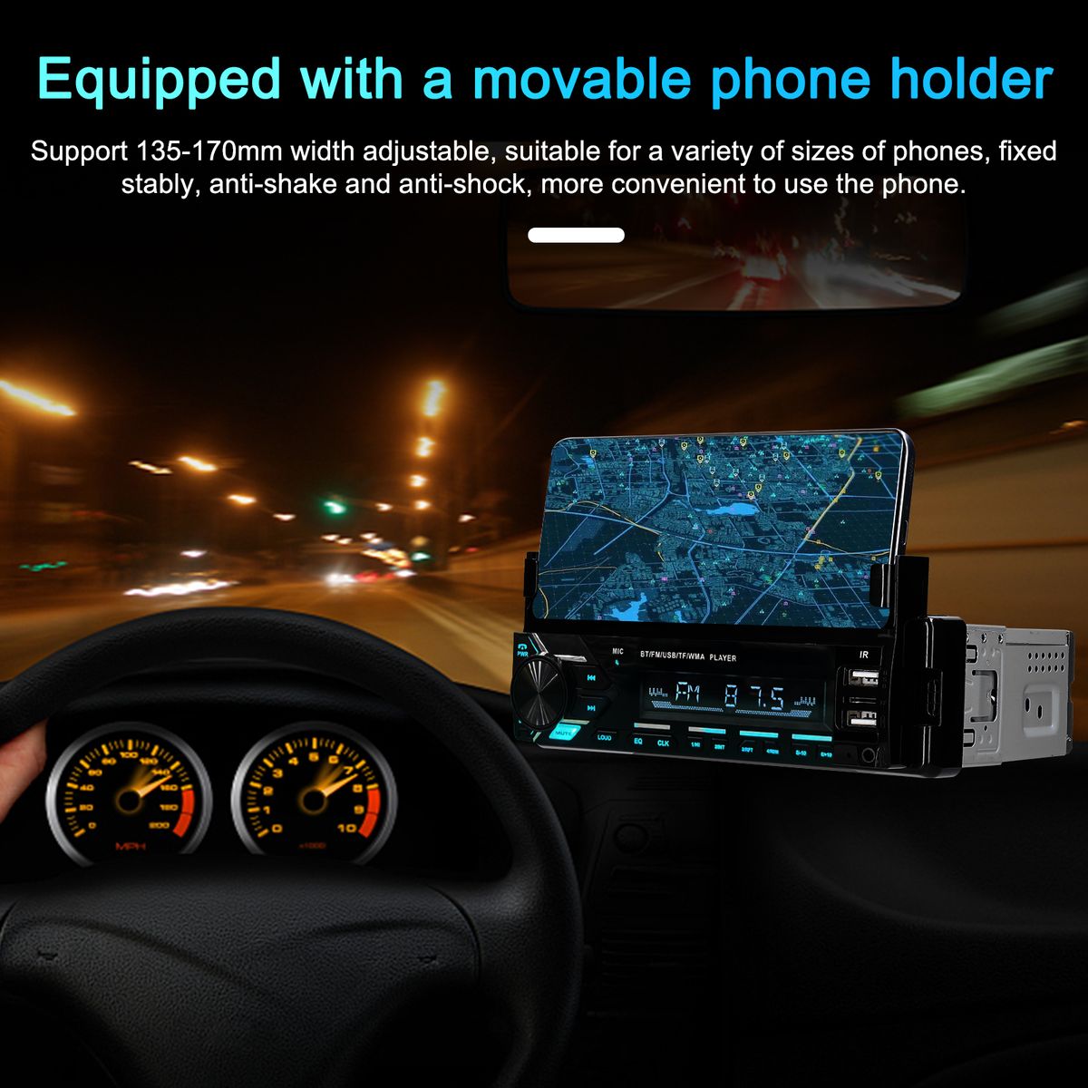Equipped with a movable phone holder, support 135-170mm width adjustable, suitable for a variety of sizes of phones, fixed stably, anti-shake and anti-shock, more convenient to use the phone.