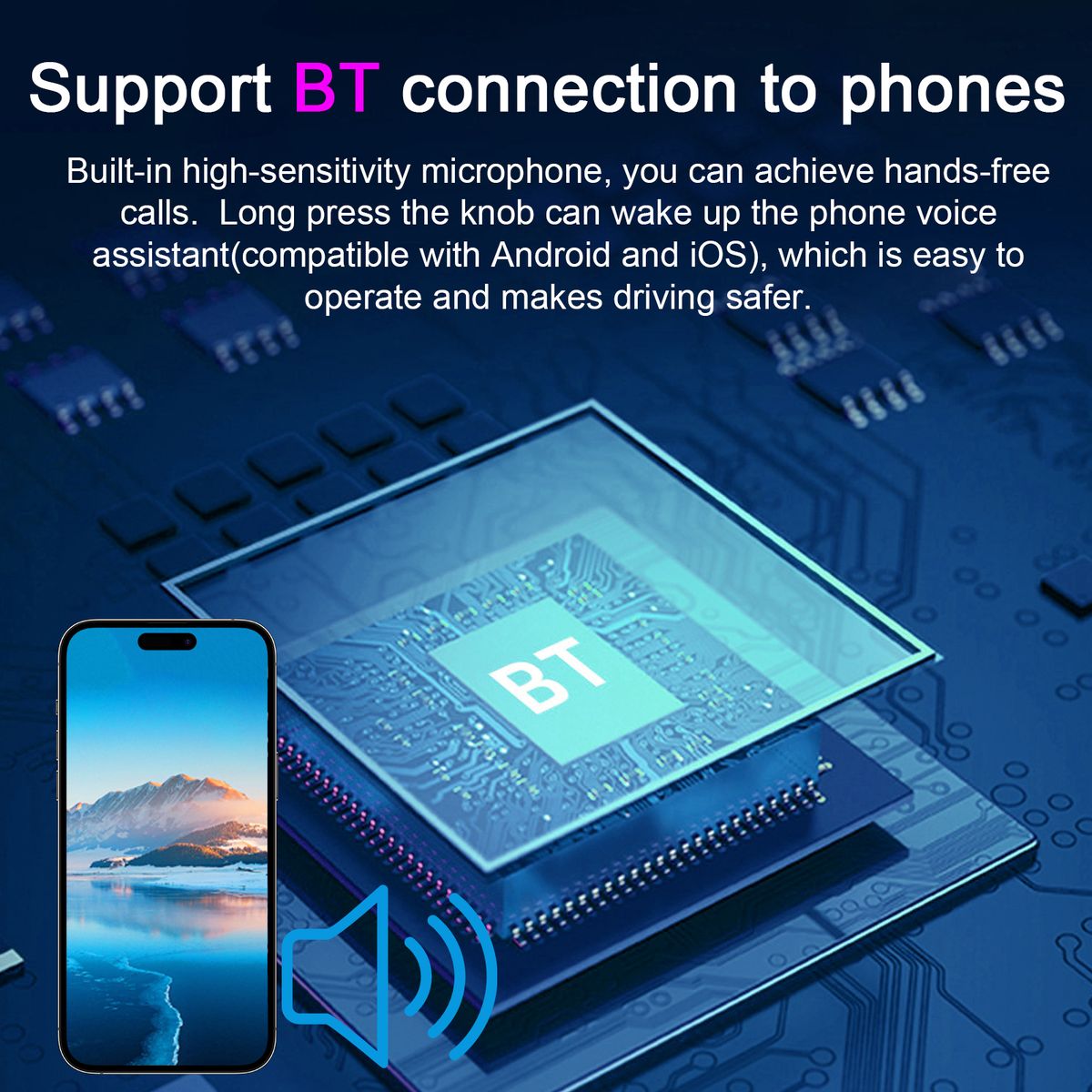Support BT connection to phones, built-in high-sensitivity microphone, you can achieve hands-free calls. Long press the knob can wake up the phone voice assistant(compatible with Android and iOS), which is easy to operate and makes driving safer.