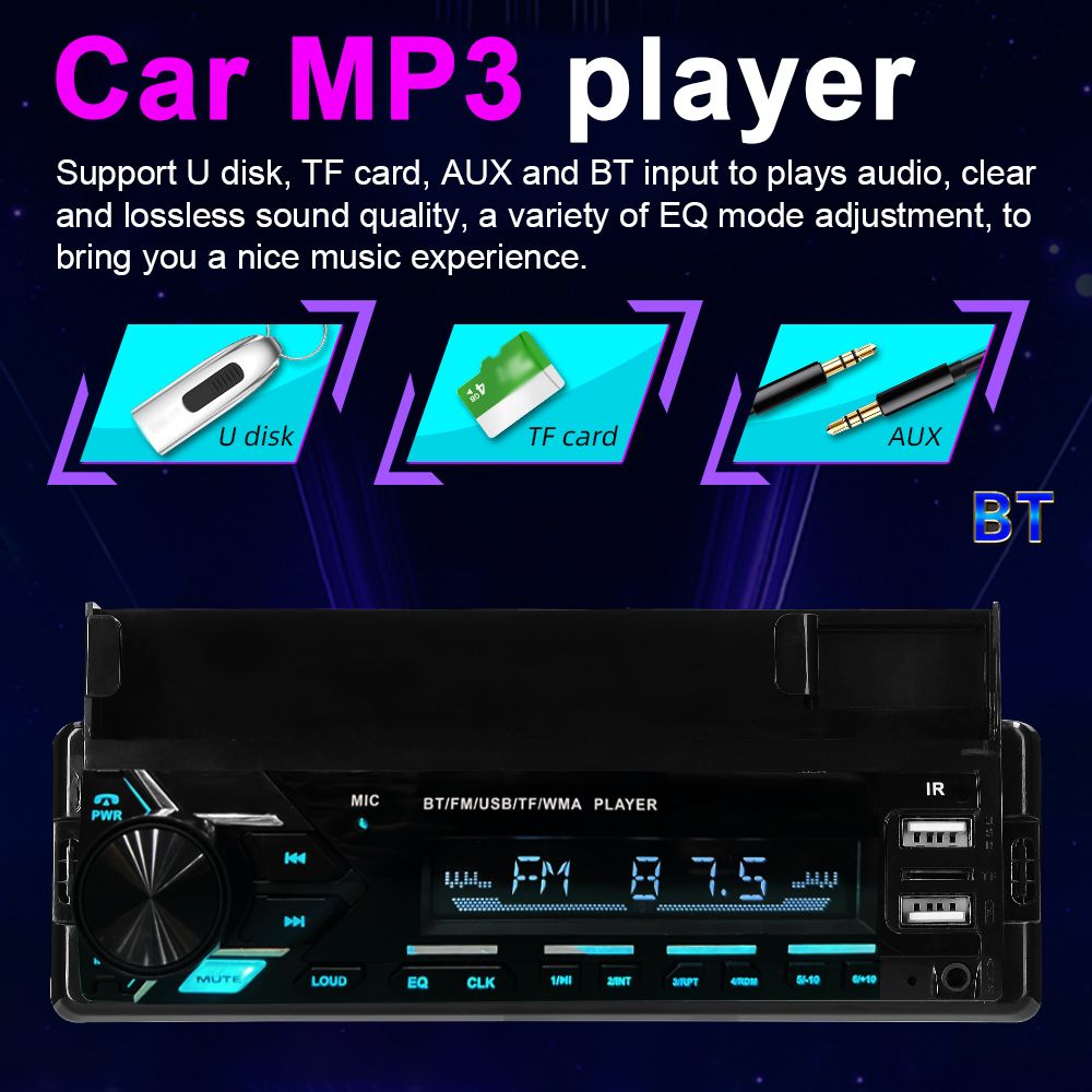 Car MP3 player, support U disk, TF card, AUX and BT input to plays audio, clear and lossless sound quality, a variety of EQ mode adjustment, to bring you a nice musical experience.