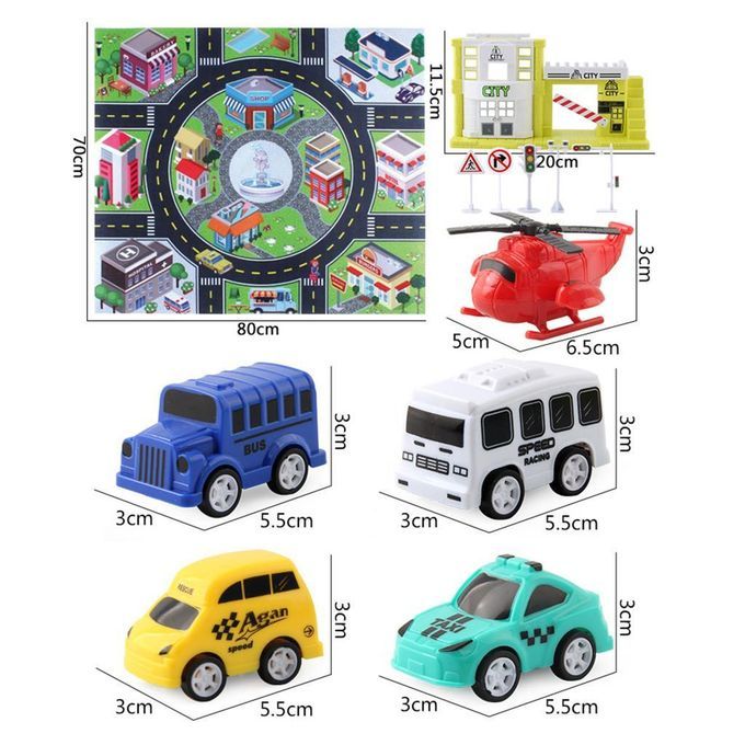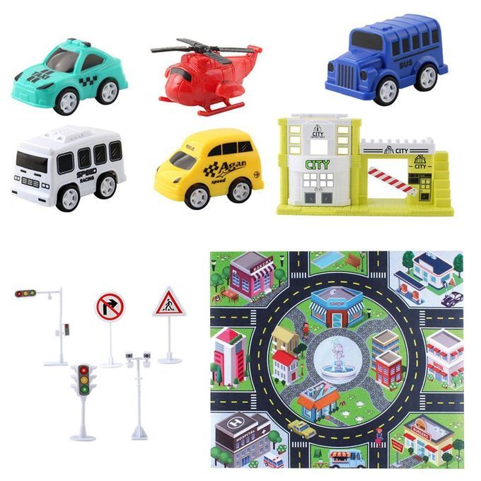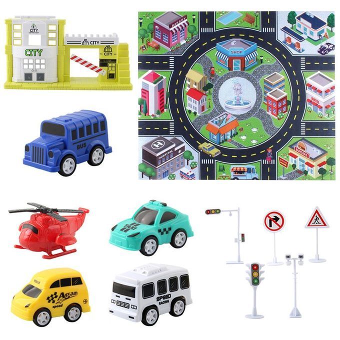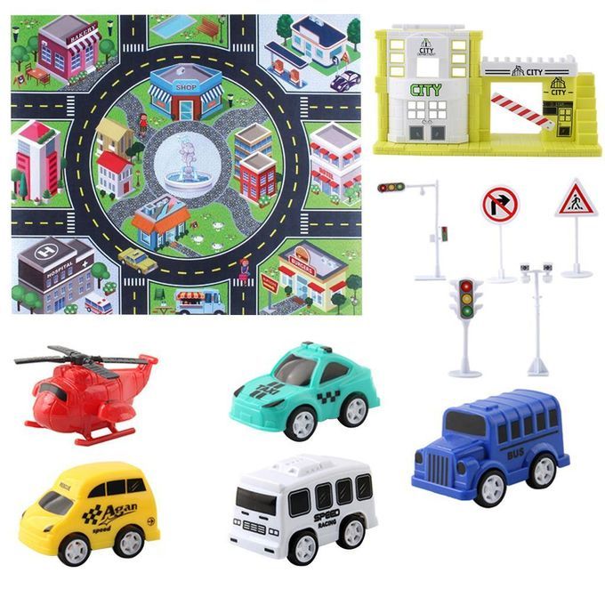 Our Toy Car Sets with Giant City Playing Mat includes a 31.5" x 27.5" carpet playmat and cars, road sign, building etc.