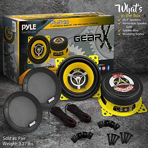 Details: Pyle Model : PLG4.24 inh Component Car SpeakersPyle Gear 4 -inh Coaxial Car Speaker Pair - 2-Way Vehile Speakers, 140 Watt MAXFeatures:Universal Standard Size Fits OEM Loations2-Way Stereo Sound ReprodutionYellow Color Poly Injeted ConeNon-Fatiguing Butyl Rubber Surround0.5 Neodymium Dome TweeterHigh Temperature Aluminum Voie CoilStrong Capaitor for Exellent PerformaneYellow Coated Steel BasketRubber Magnet CoverInludes Custom Grills, Wires and Installation HardwareWhats in the Box:(2) 4 SpeakersRemovable Speaker GrillsSpeaker WireMounting SrewsTehnial Spes:Power Handling: 140 Watt MAX / Watt RMSSpeaker Size: 4 -inhesFrequeny Response: -20kHz20 oz. Magnet StrutureImpedane: 4 OhmsMounting Depth: 1. -inhesGet in gear with the Pyle Gear series! These speakers are designed to provide the best quality sound for the budget-minded enthusiast. These 4, two-way speakers have 140 watts of pure power, supported by a 0.5 neodymium dome tweeter for sweet highs and high temperature voie oil for rih mids. The non-fatiguing butyl rubber surround and yellow-olor poly-injeted one provide a sturdy foundation for keeping your sound rystal lear and distortion-free. The 20 oz. magnet struture allows speakers to ahieve a frequeny response of Hz to 20 kHz. To boost performane, speakers have been equipped with a strong apaitor, meaning your speakers will never struggle for power. These speakers look ool, too, thanks to the yellow oated steel basket. Inludes ustom grills, wires, and installation hardware. Youll hear everything you were meant to hear with Pyle Gear.