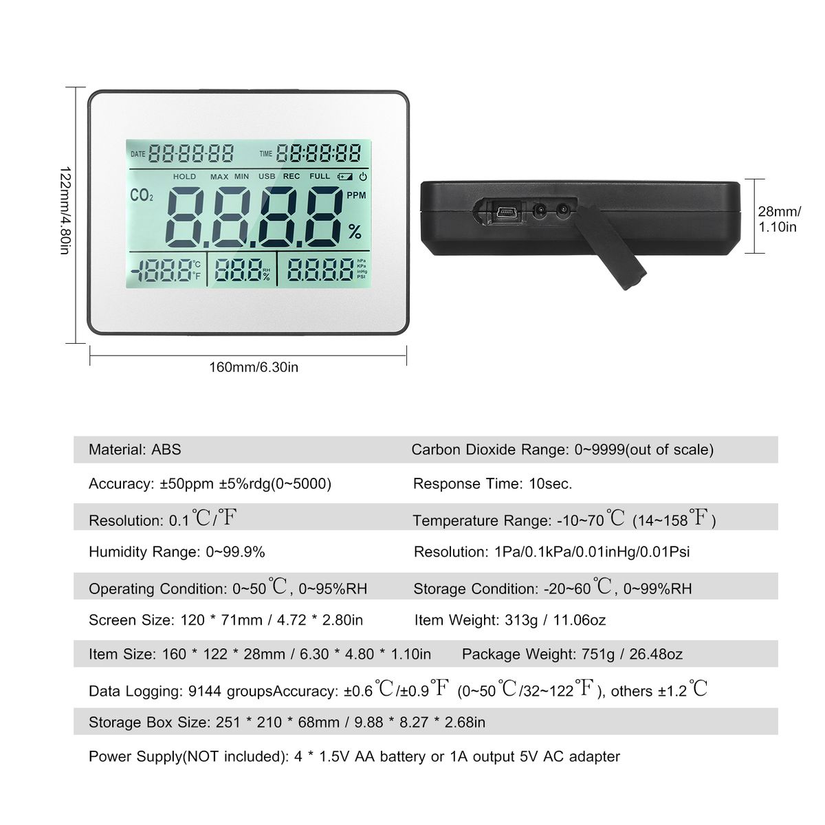 Multifunctional CO2 Detector: can measure the CO2 concentration(PPM), air temperature(℃/℉), humidity(%), barometric pressure(hPa, kPa, inHg, PSI), and it has perpetual calendar and time display.