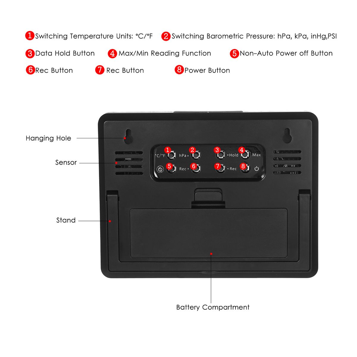 Barometric Pressure Range: 10~1100hPa/1~110kPa/0.29~32.48inHg/0.15~16.00PSI