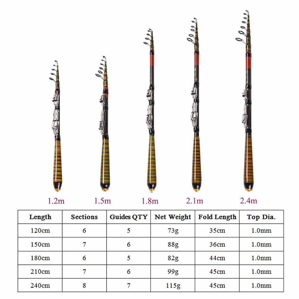 Length Sections Guides QTY Net Weight Fold Length Top Dia. 120cm 6 5 73g 35cm 1.0mm 150cm 7 6 88g 36cm 1.0mm 180cm 6 5 82g 44cm 1.0mm 210cm 7 6 99g 45cm 1.0mm 240cm 8 7 115g 45cm 1.0mm