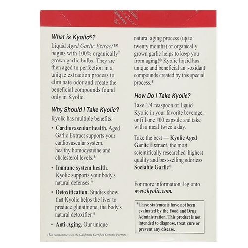 Kyolic Liquid begins with time-tested organic farming techniques. Organic cultivation is essential to grow naturally balanced garlic bulbs. Kyolic liquid is rich is essential nutrients, free from pesticides or herbicides. Kyolic Liquid is the Original Liquid Formula. Kyolic originated with a liquid formula Aged Garlic Extract over 40 years ago. Kyolic is the world's best-selling garlic supplement. One of the benefits of the liquid form is that it is absorbed and assimilated by the body faster than other forms.