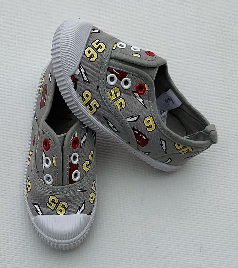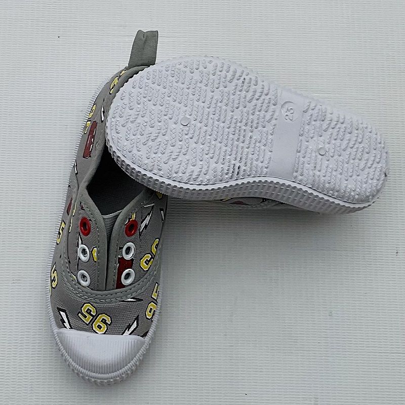 Cars 95 print sneaker for boys by Cerda. Made in soft canvas, the uppers have a rainbow print finish. Lined in soft leather, they have a rubber sole and fasten with a velcro strap.