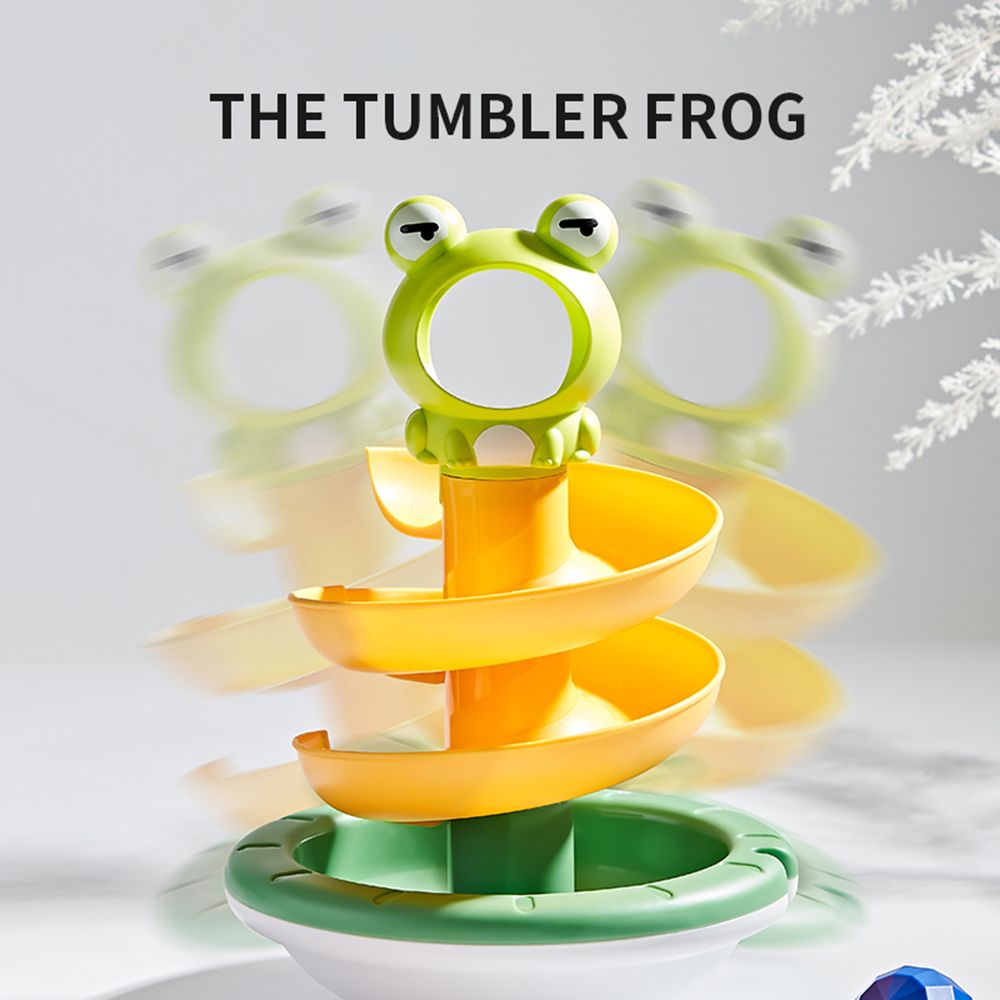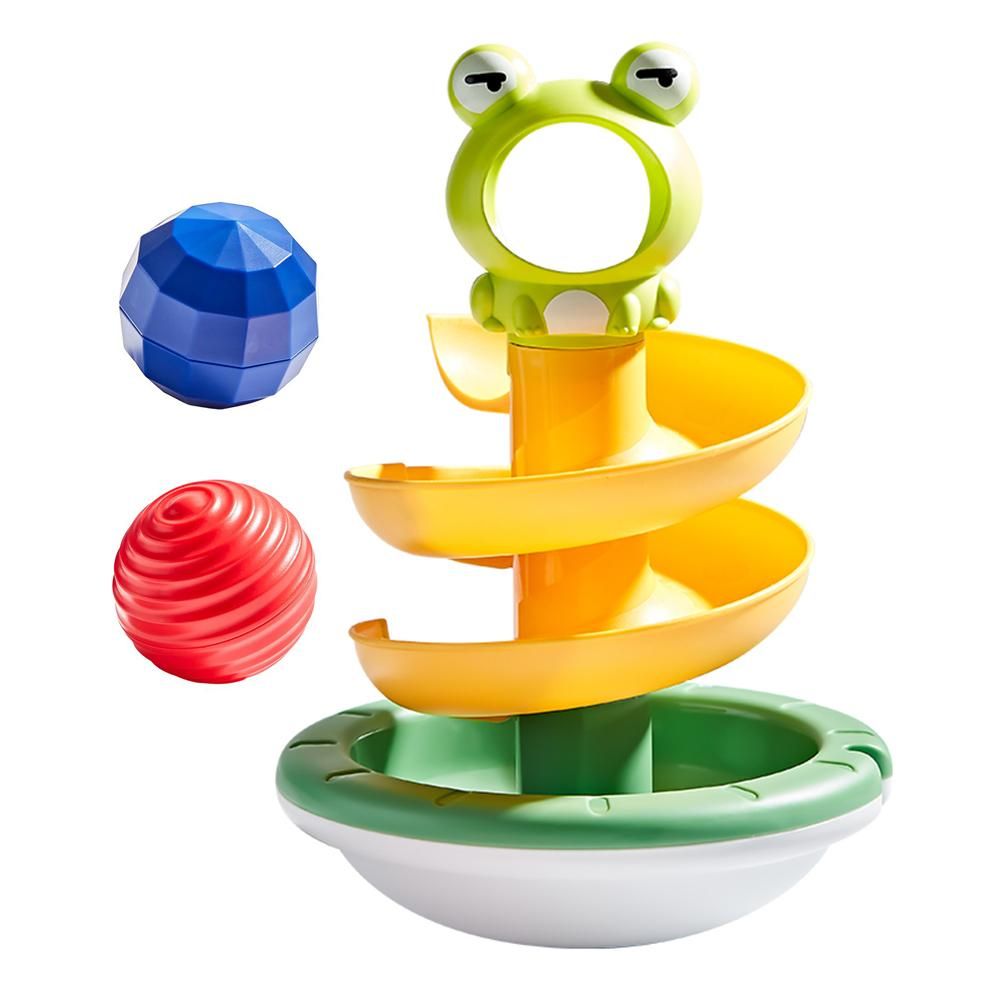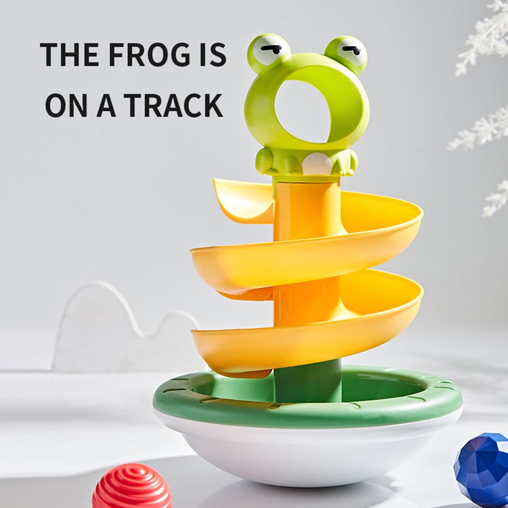 Easy for kids to play. Just put the ball into the mouth of cartoon frog, then watch the ball roll to bottom holder through the slide.