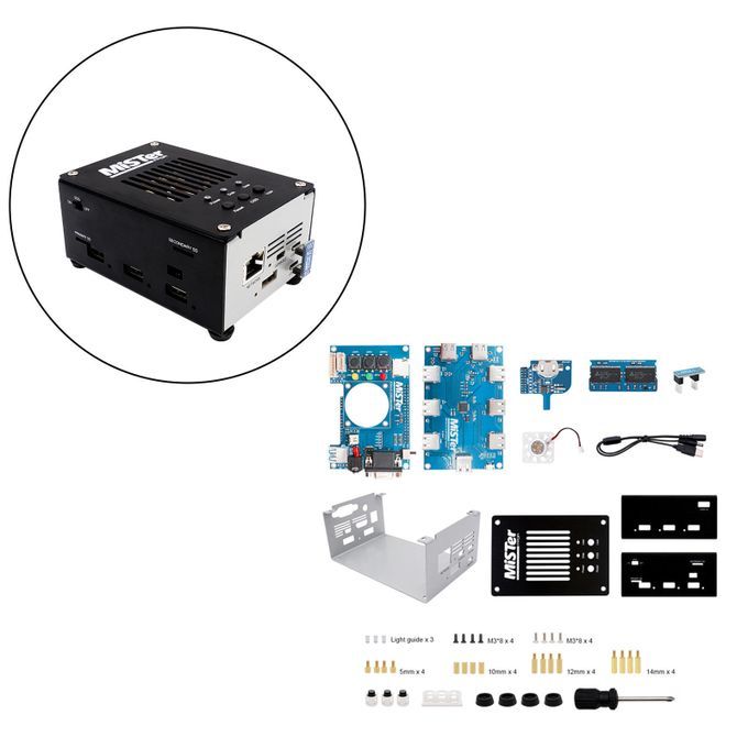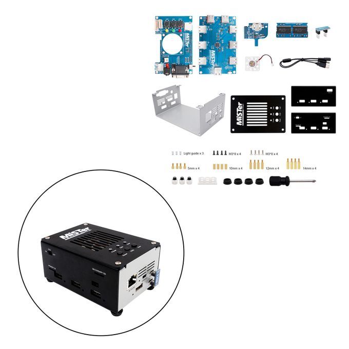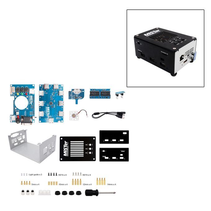 4 pieces metal cases1 piece screwdriver1 piece Screw accessories1 piece MisTer v2.1 USB Hub Board1 piece USB Bridge1 piece power cable1 piece MisTer v6.1 I/O Board1 piece normal fan1 piece RTC Board1 piece MisTer SDRAM XS 128MB Board