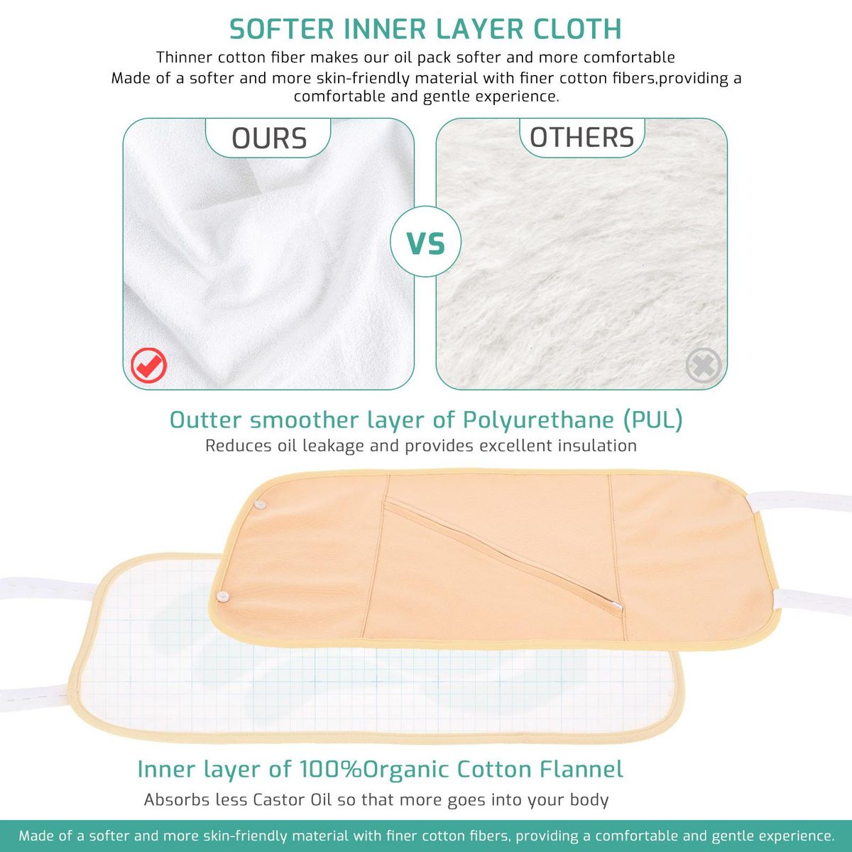 【Water And Oil Resistant】:This castor oil compress is made of waterproof PU cloth and combed cotton, the outer layer of the pack can prevent oil from leaking through, avoid leakage, and keep you away from oil stains, machine washable, and can be washed many times, reusable.