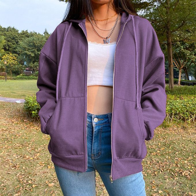 Buy Casual Sweatshirt Zipper Outwear Loose Pocket Collar Sleeve Purple M in Nigeria