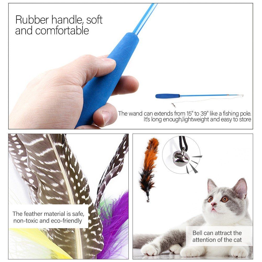 Retractable and Flexible and Lightweight: The wand extends from 15-39 inch like a fishing pole. It\'s long enough and lightweight, swing easily and save your energy, making tease a cat is no longer a manual job for you. Retracted to smaller size after play, easy to store. It is flexible and strong, even with an aggressive cat.