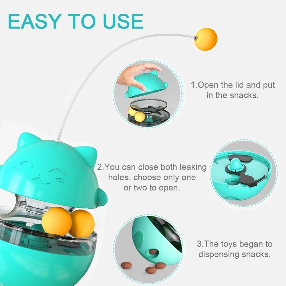 bull; Food Dispensing: The treats coming out from the bottom hole when your cat playing with the ball. The slow down feeding way is beneficial to your cat\\\'s health. It helps increase your cat\\\'s IQ by understanding the usage. You can close both leaking holes, choose only one or two to open.