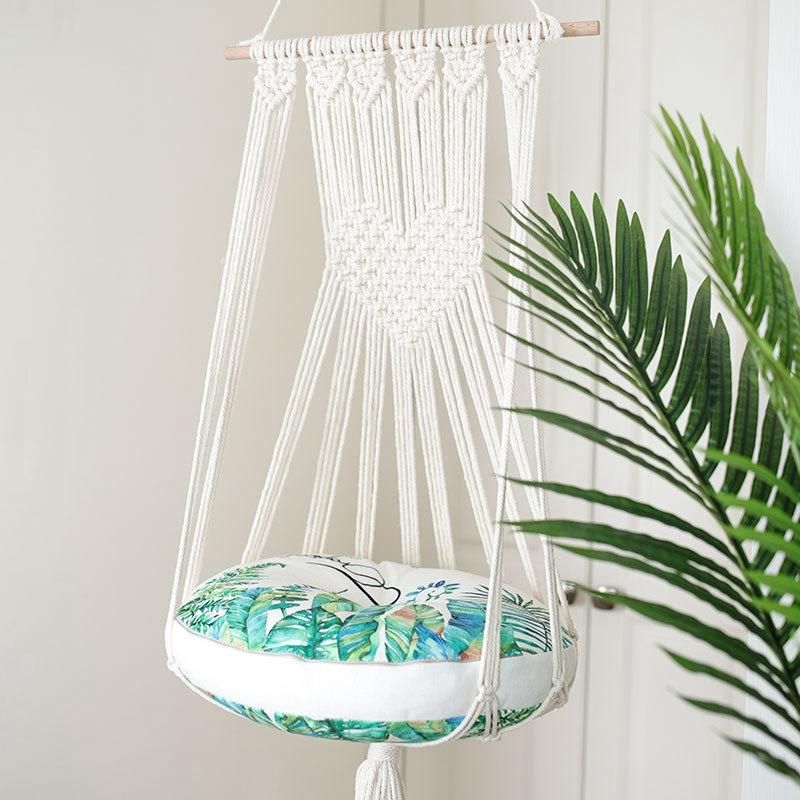Our macrame cat swing with cushion bed are a seamless addition to any room's decor!Thanks to its round shape bed, It is Perfect for pets who love to curl up! This macrame lounger is leaving your cat in an island mindset.