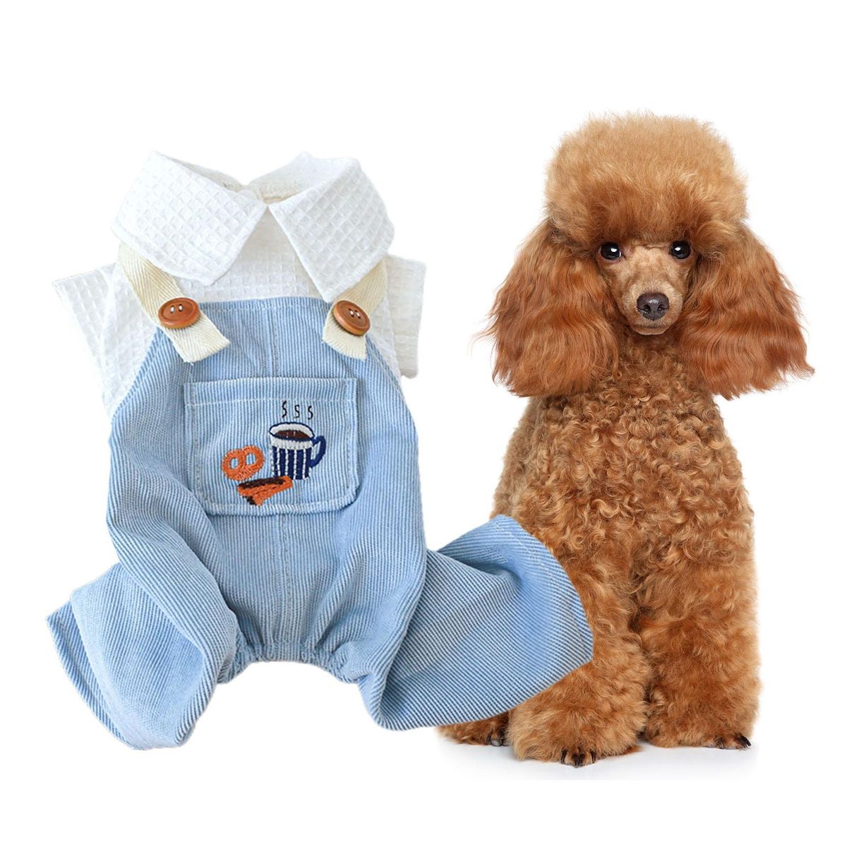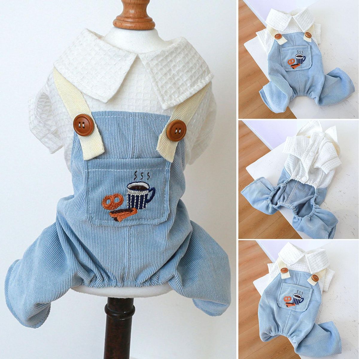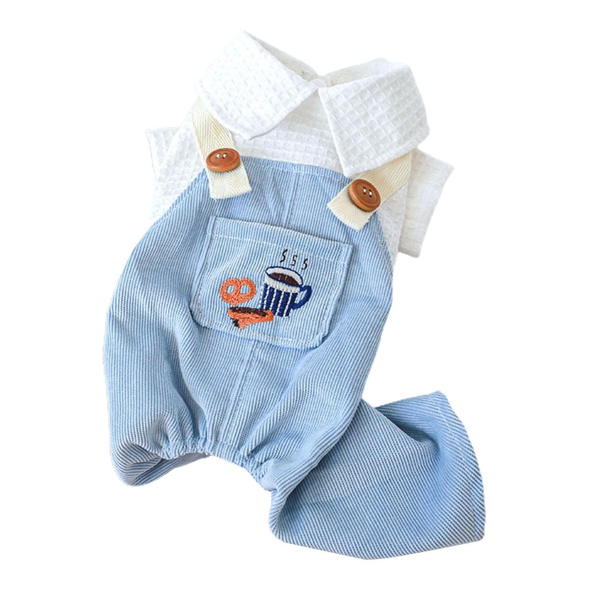 A pet jumpsuit with cartoon coffee and bread patterns, pocket decoration and doll collar is lovely and exquisite in workmanship. It uses buttons to open and close, which is convenient to wear.