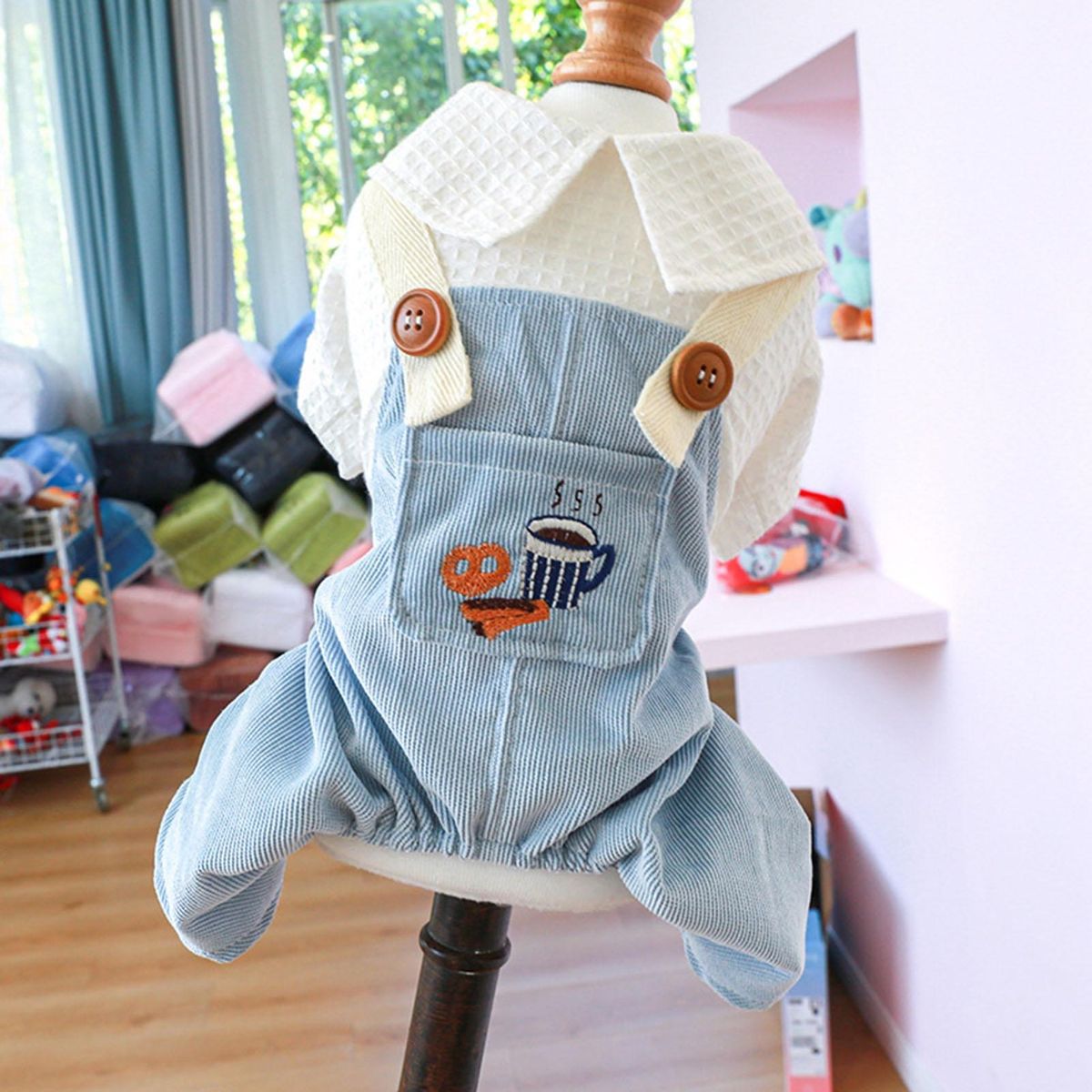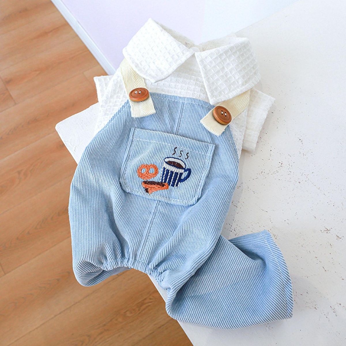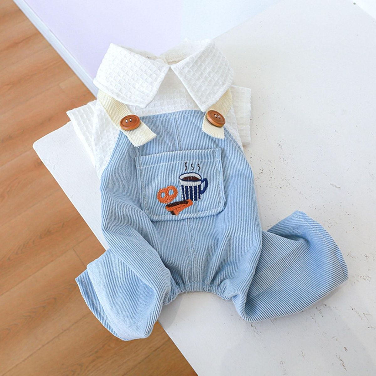 A pet jumpsuit with cartoon coffee and bread patterns, pocket decoration and doll collar is lovely and exquisite in workmanship. It uses buttons to open and close, which is convenient to wear.