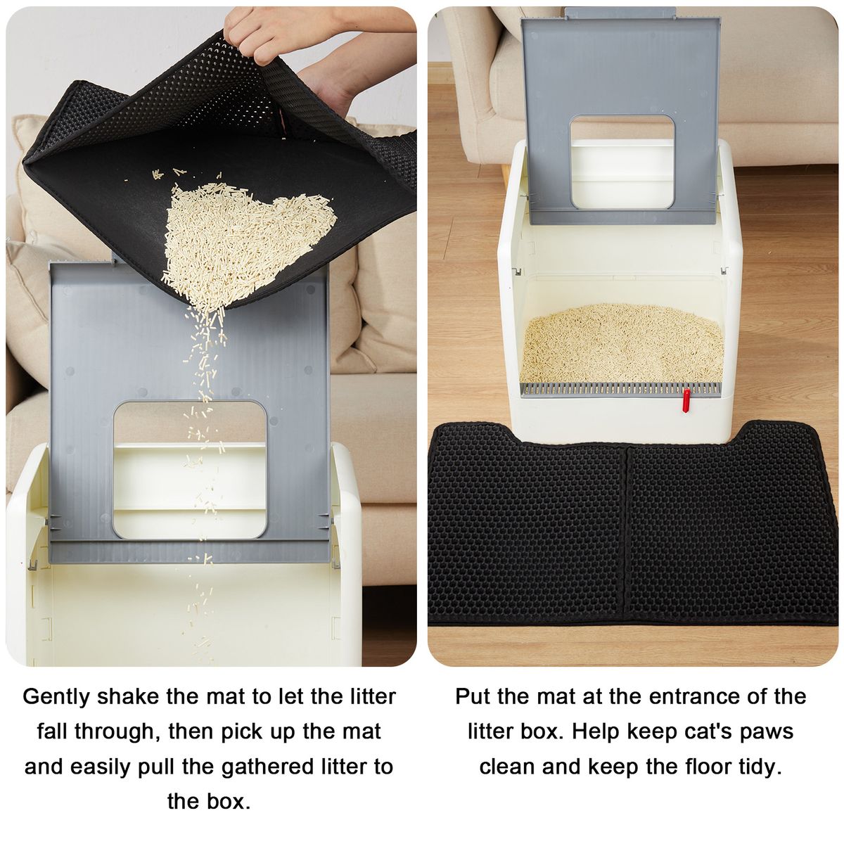 Convenient Recycling: Gently shake the mat to let the litter fall through, then pick up the mat and easily pull the gathered litter to the box.