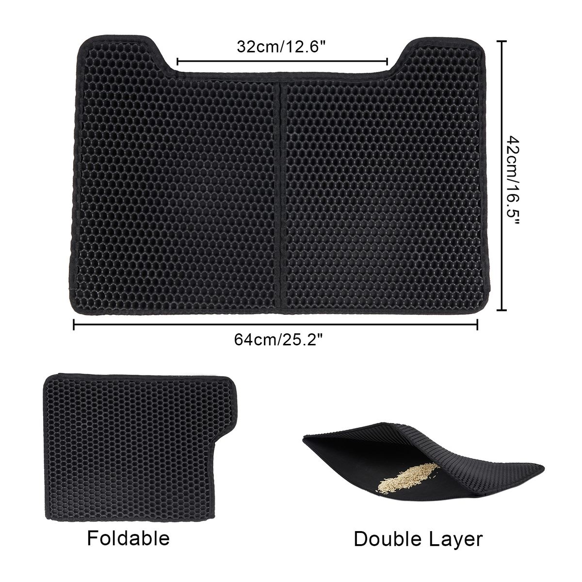 Description:Litter box door mat for filtering and gathering dropped litter. Double layer and EVA material are soft to the paws. Hollow out honeycomb holes allow litter to fall through. Easily pick up the mat to pull the trapped litter to the litter box. Have one to put at the entrance of the litter box.
