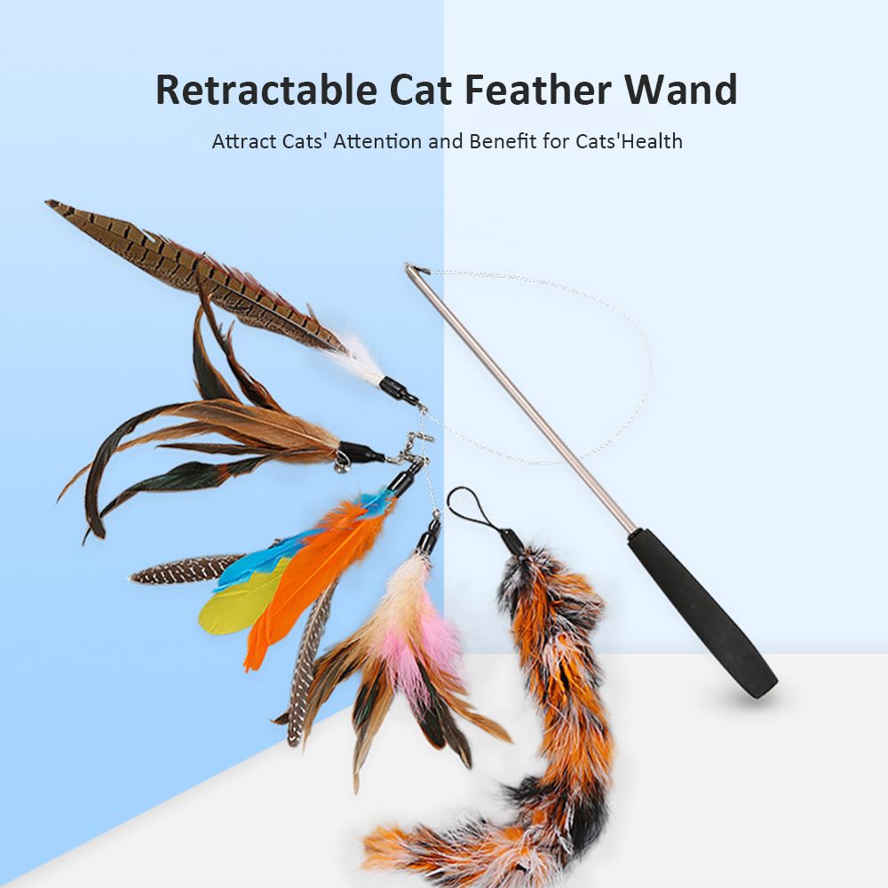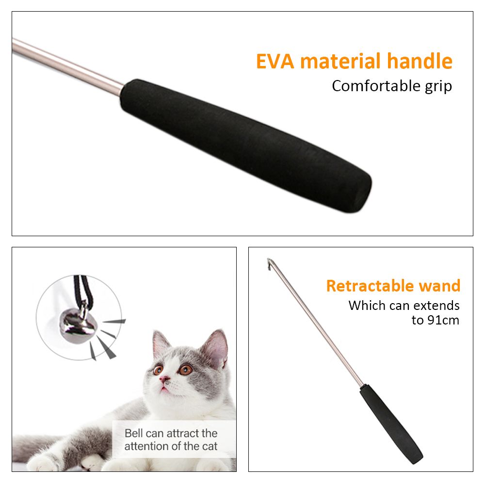 Retractable and Flexible and Lightweight: The wand extends to 91cm like a fishing pole. It\'s long enough and lightweight, swing easily and save your energy, making tease a cat is no longer a manual job for you. Retracted to a smaller size after play, easy to store. It is flexible and strong, even with an aggressive cat.