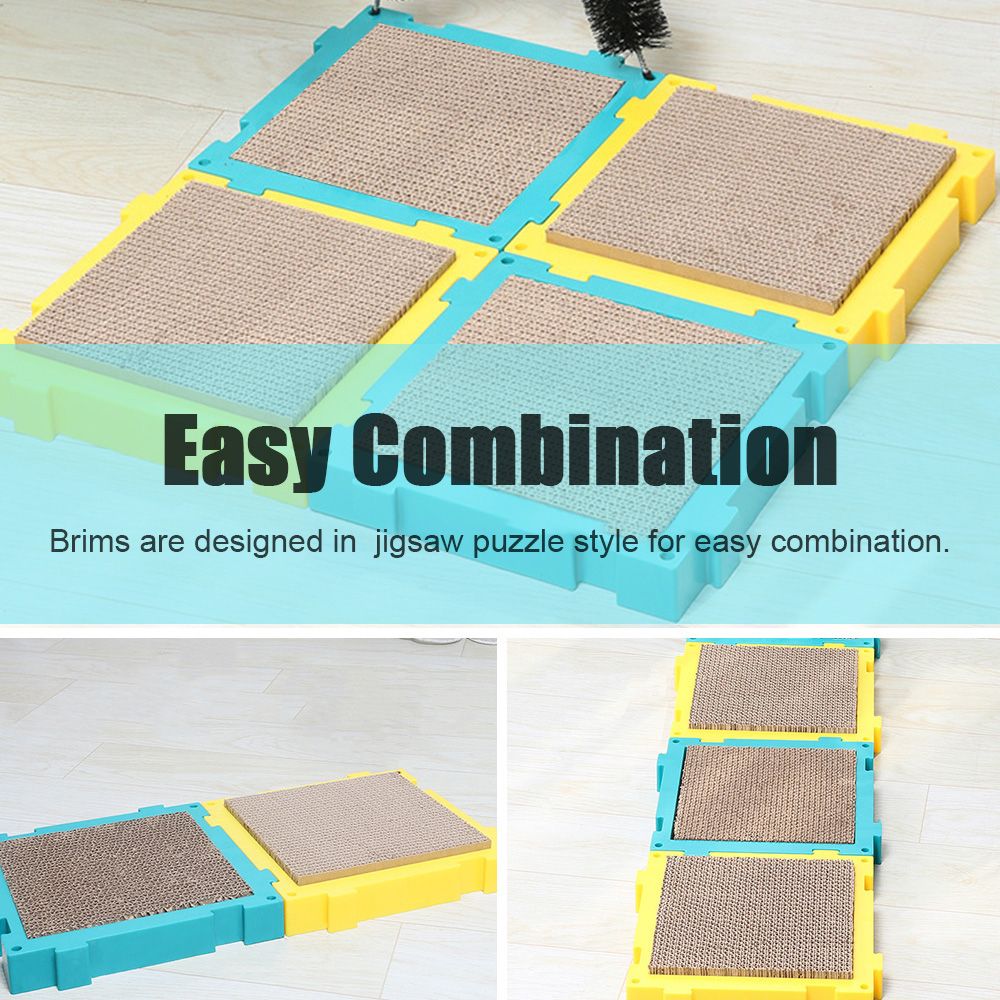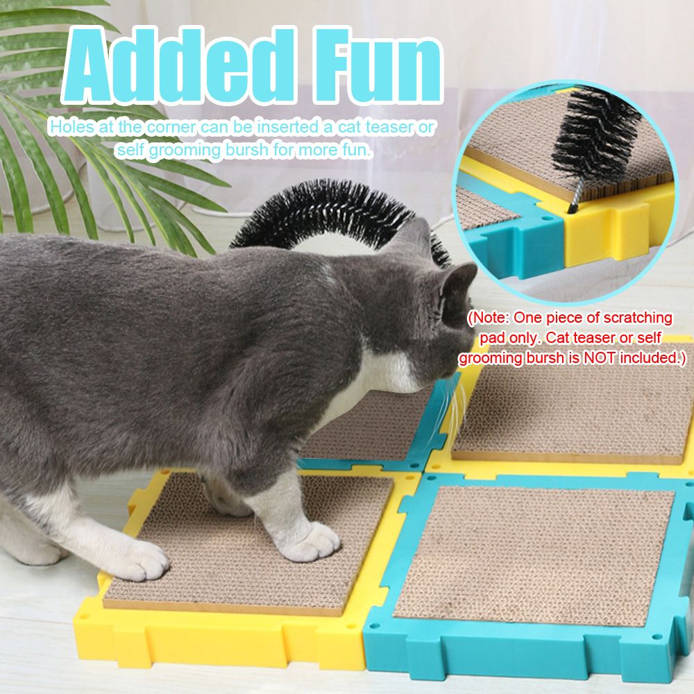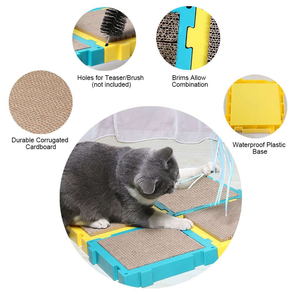 Satisfy your cat\'s need to scratch claws and save the furniture. This cardboard toy with plastic base has holes for inserting a cat teaser. This 9.3 quot;x9.3 quot;x1.4 quot; square shape in jigsaw puzzle style, can be assembled together to get a larger pad.