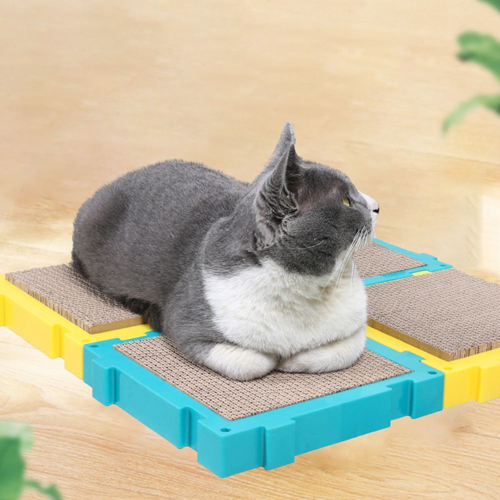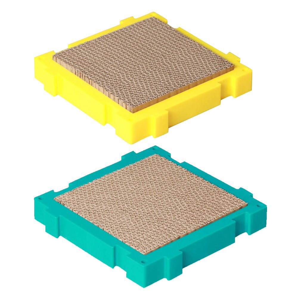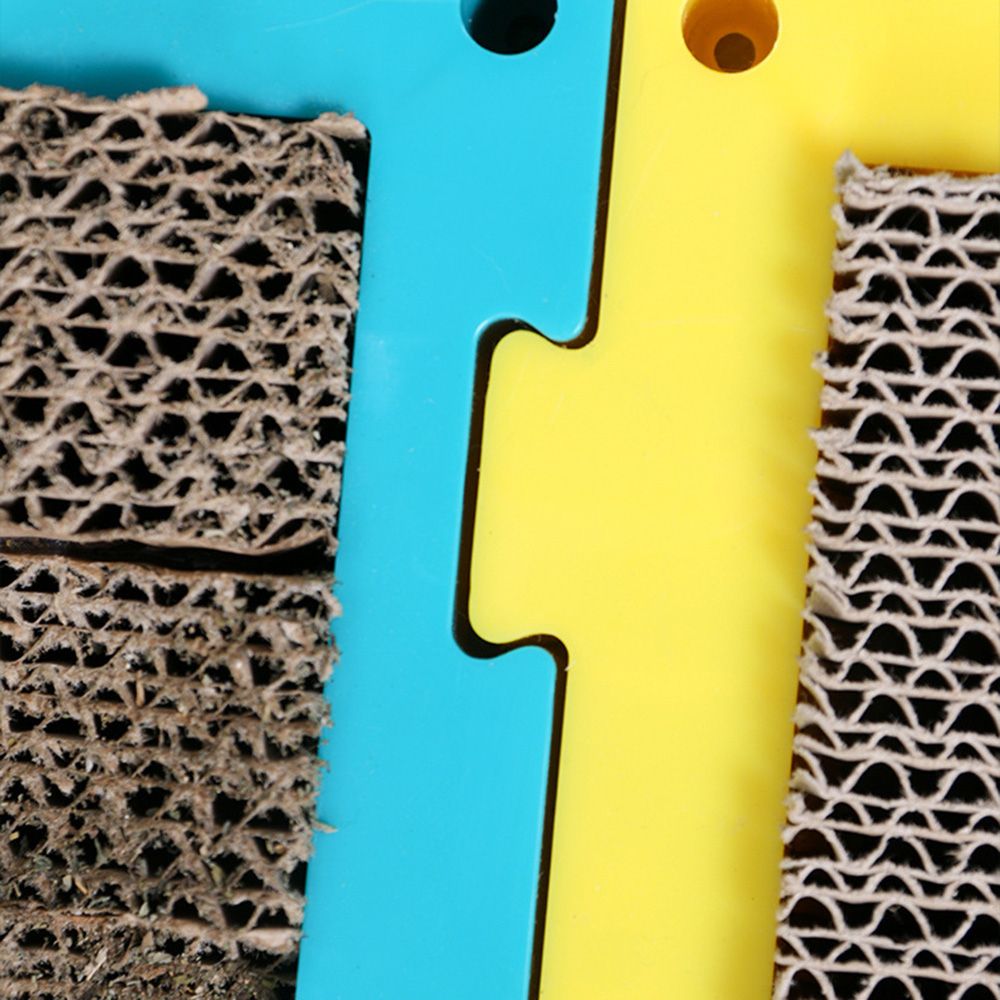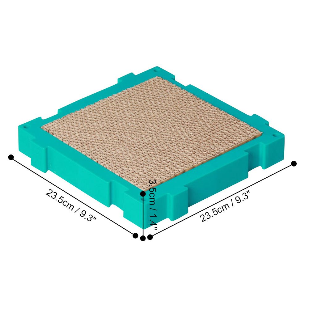 Satisfy your cat\'s need to scratch claws and save the furniture. This cardboard toy with plastic base has holes for inserting a cat teaser. This 9.3 quot;x9.3 quot;x1.4 quot; square shape in jigsaw puzzle style, can be assembled together to get a larger pad.