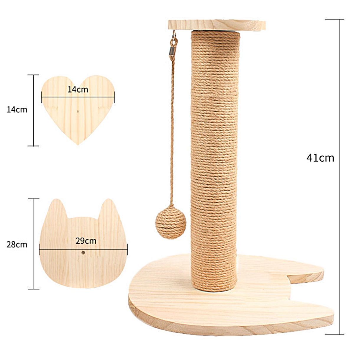 A scratched post with a base designed in the shape of a cat's face and a heart-shaped top designed with a ball hanging from it, the workmanship is exquisite and the hanging ball easily attracts the cat's attention.