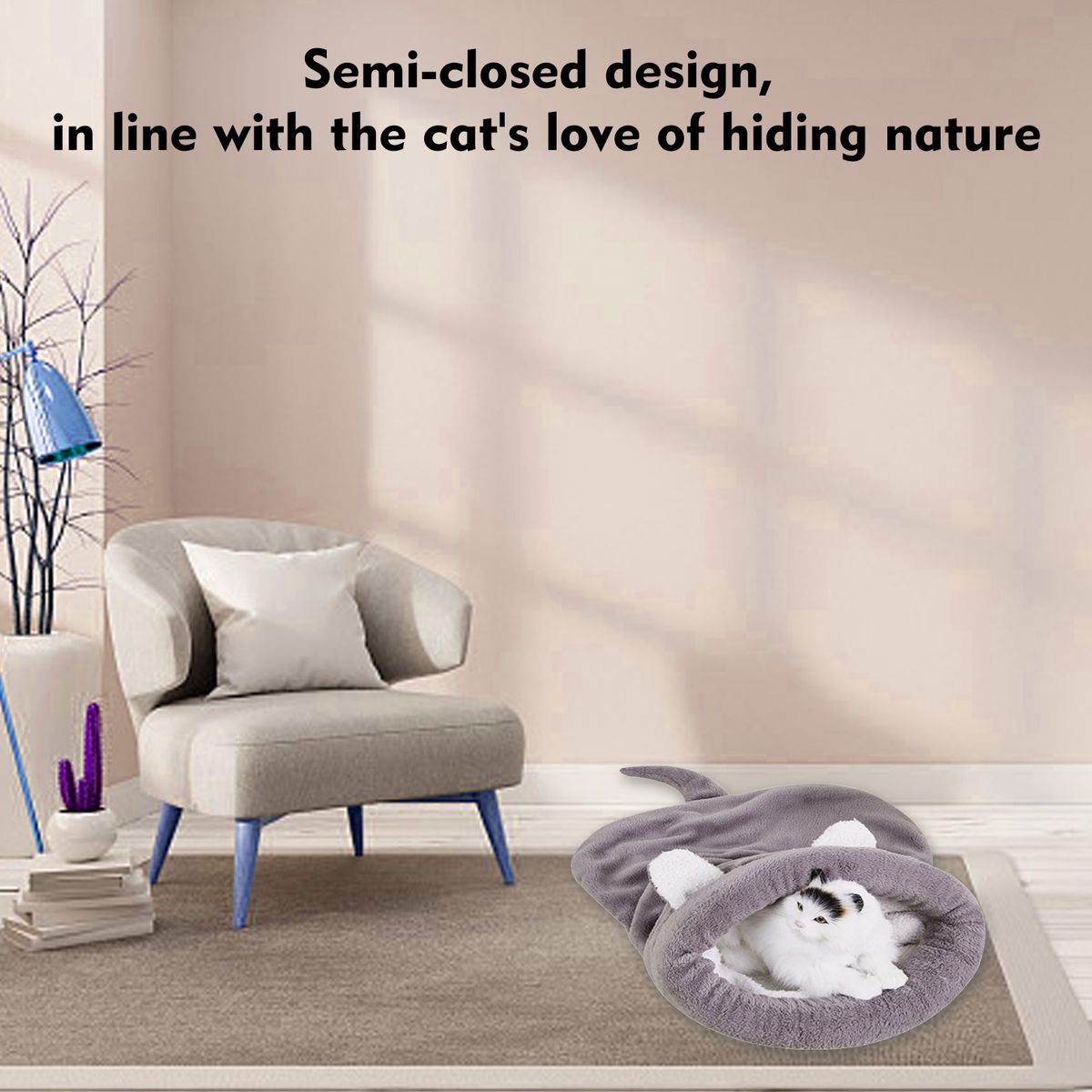 Semi-closed design, in line with the cat\'s love of hiding nature.