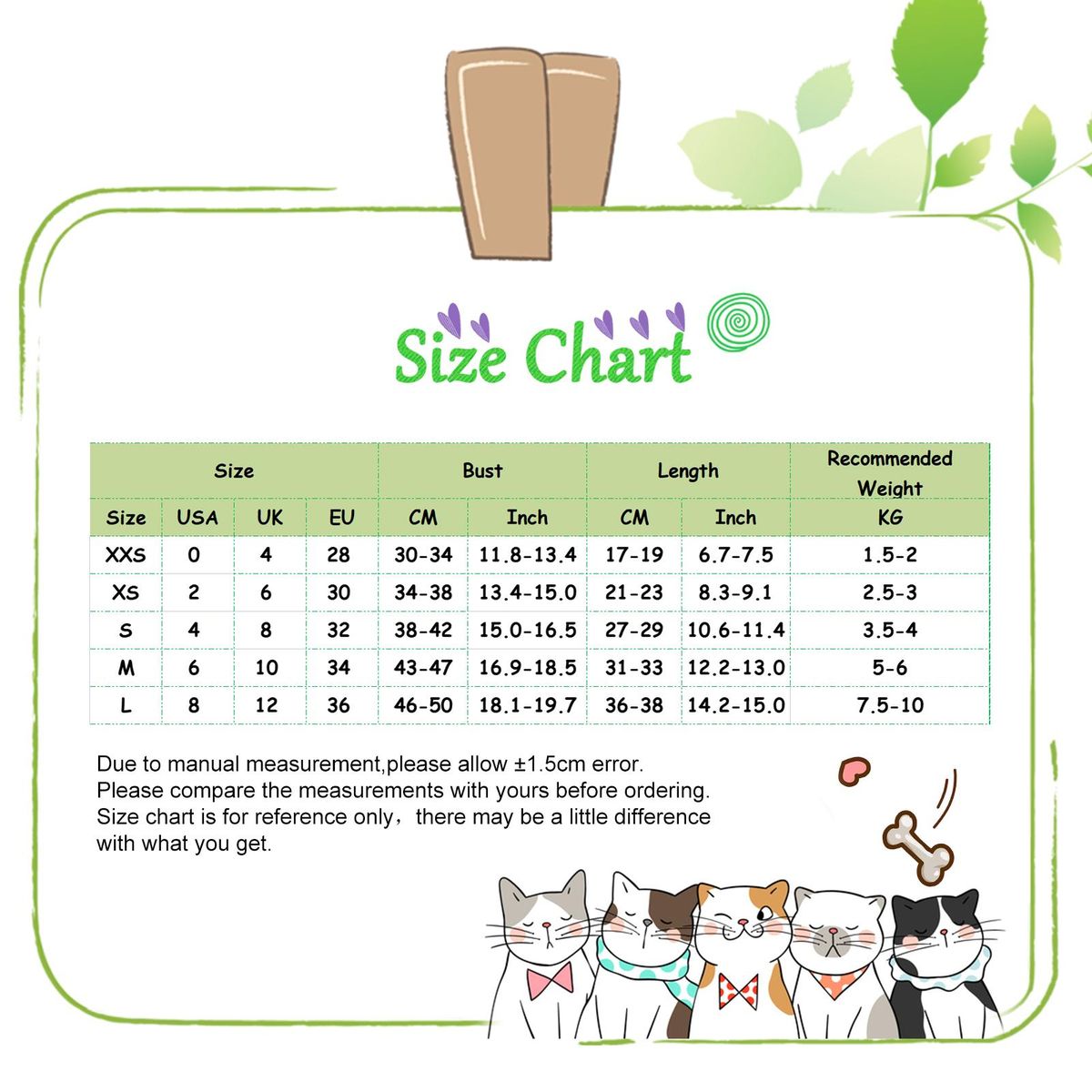 [Our Size XXS] Bust: 30cm-34cm/11.8"-13.4", Length: 17cm-19cm/6.7"-7.5", Suggested Weight: 1.5kg-2kg (Approx.)