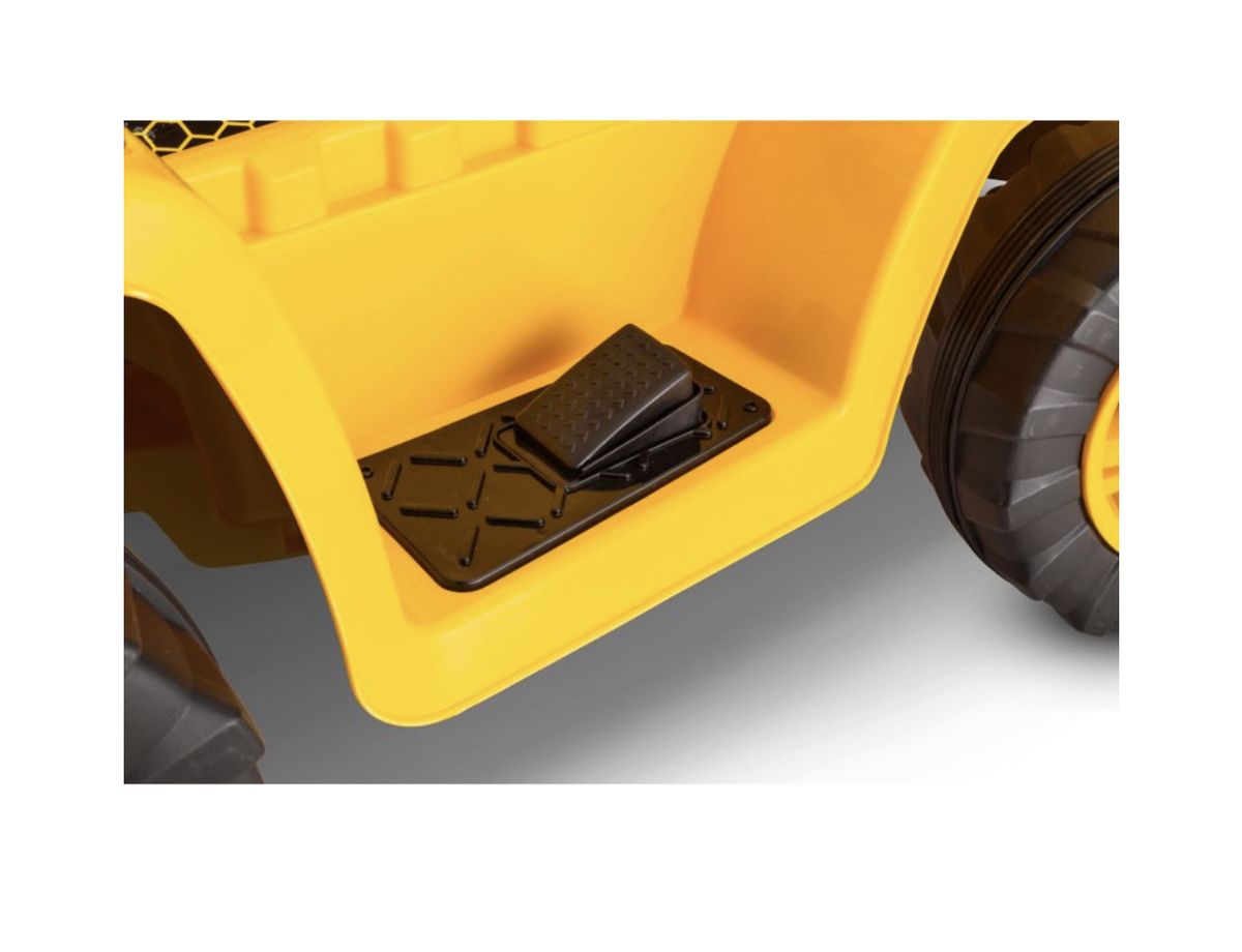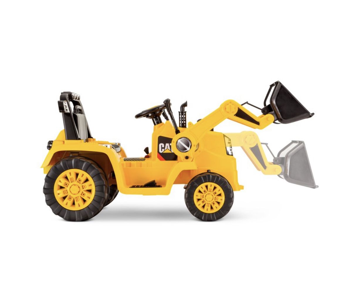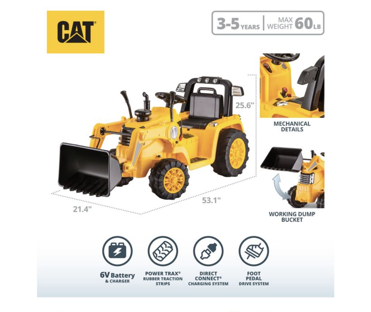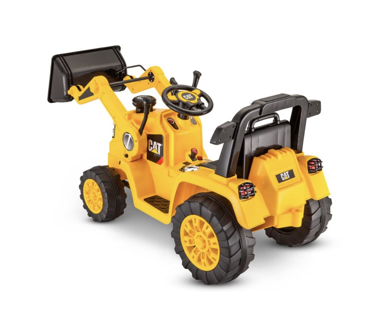 Classic CAT construction designFunctional dump bucket for realistic playKid Trax CAT ride-on with real foot pedal acceleration just like the real vehiclePower Trax rubber traction strip tires for enhanced grip on different surfacesRechargeable battery with direct connect charging system so playtime doesn't have to stop for longDigger ride-on toy with vibrant yellow and black design and CAT logos just like the real thingBuild lasting memories through imaginative playIncludes steering wheel and levers on the top for easy operation
