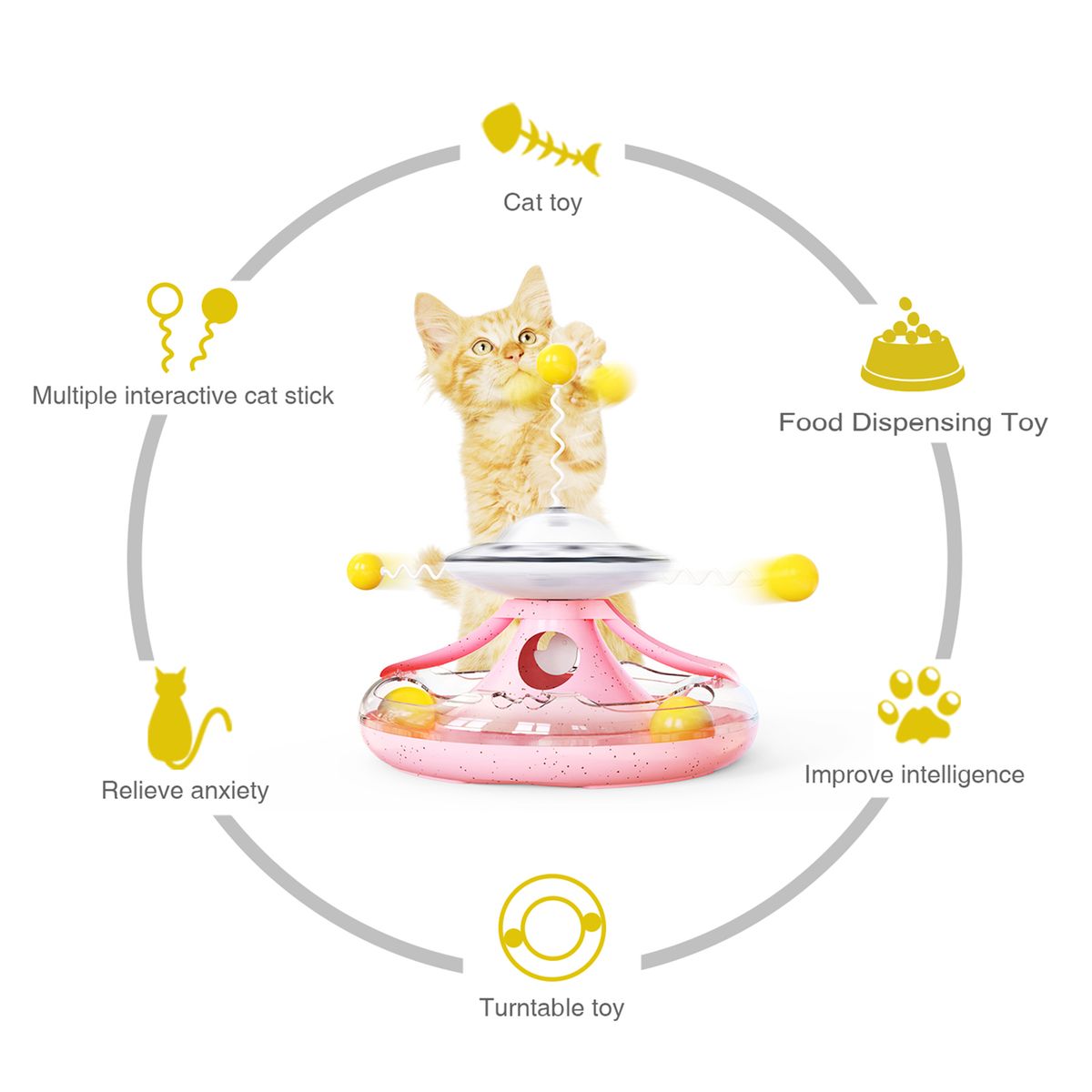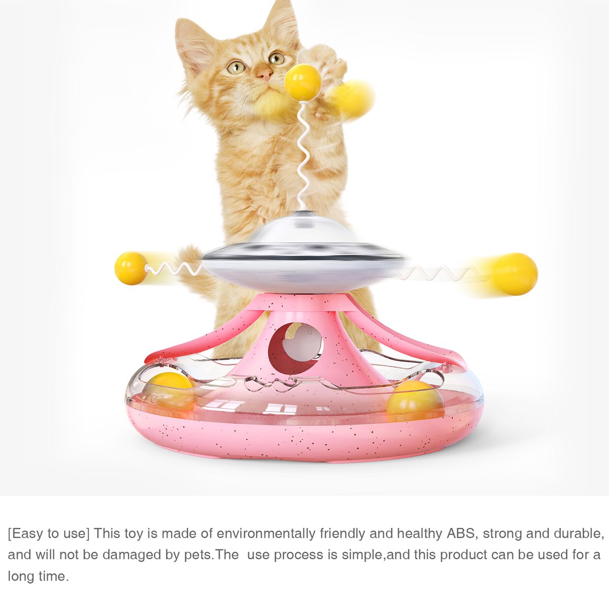 [Multifunctional fun cat toy] This is a multifunctional fun cat toy, which integrates many functions such as trackballs, food dispensing turntable, and interactive cat stick. It is also a toy to help improve the intelligence of pets.