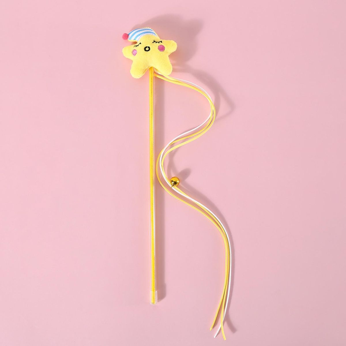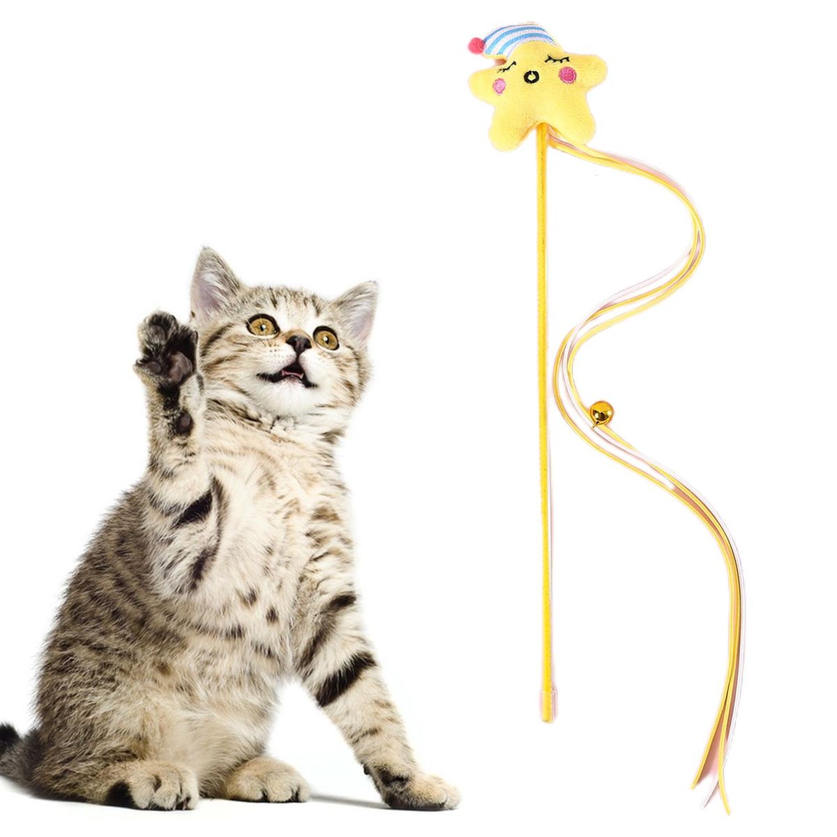 A cat-teasing stick is made up of plush moon, plush stars, tassels and bells, with bright colors and exquisite workmanship. The ringing bells can easily attract the attention of cats and stimulate their hunting instinct.