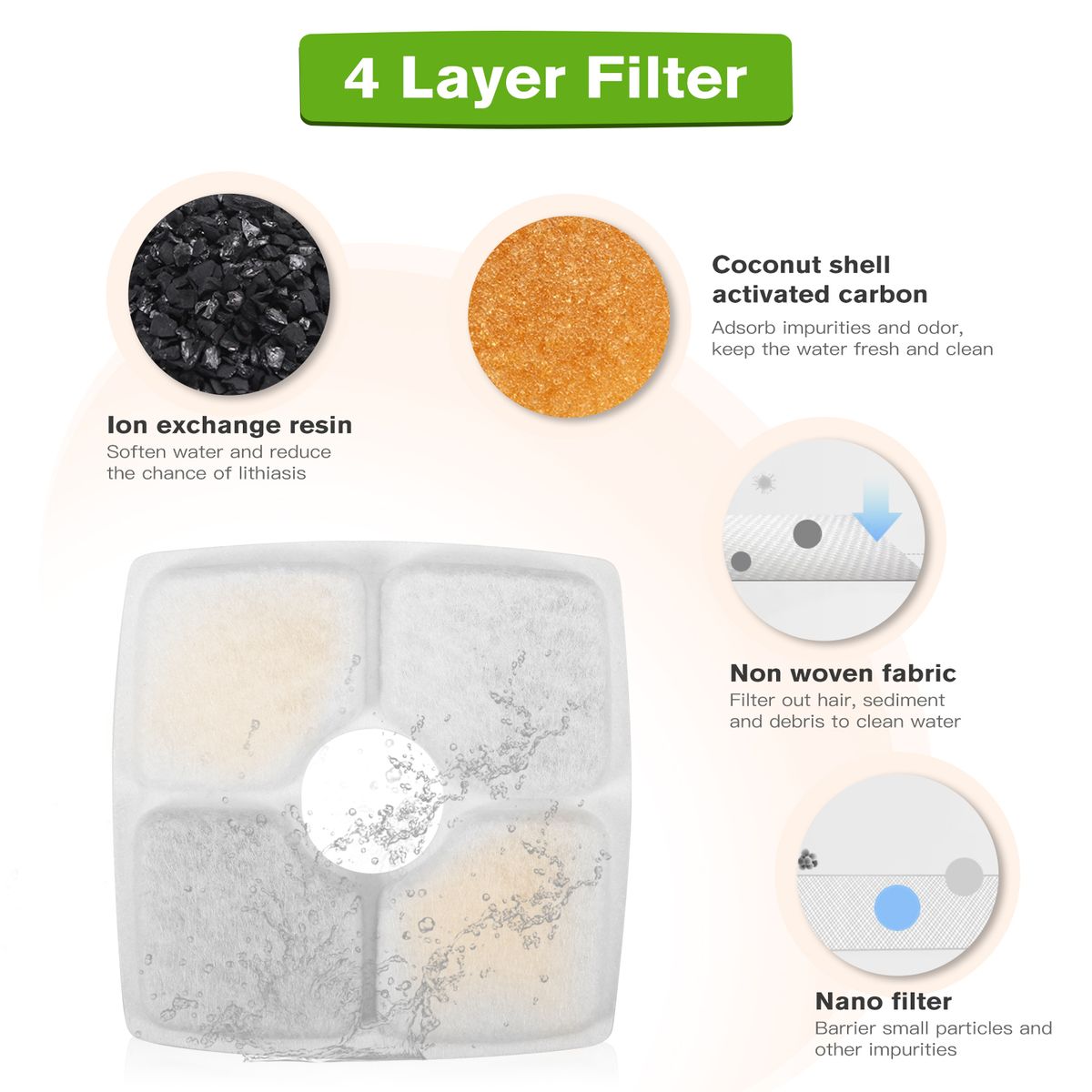 Keep Pets Healthy: Filter material in bulk is more effective. Water quality can be removed by the 4 types of filtration. 4 steps of filtration can assure the quality of the water and enhance the taste of freshwater for your cats, so as to protect your pet's health.
