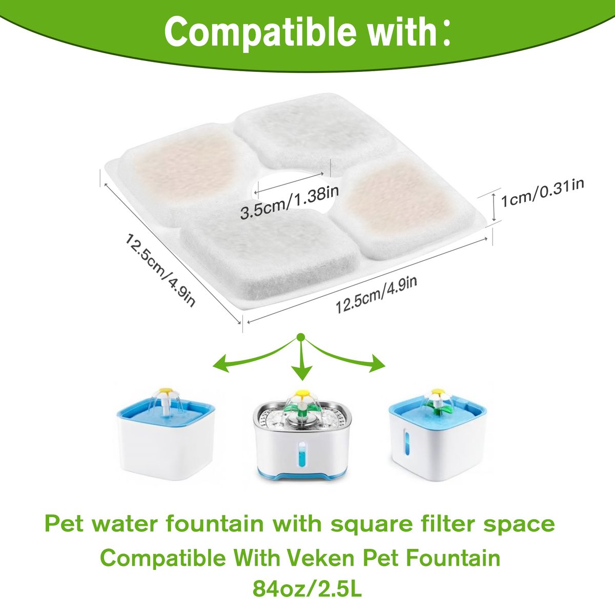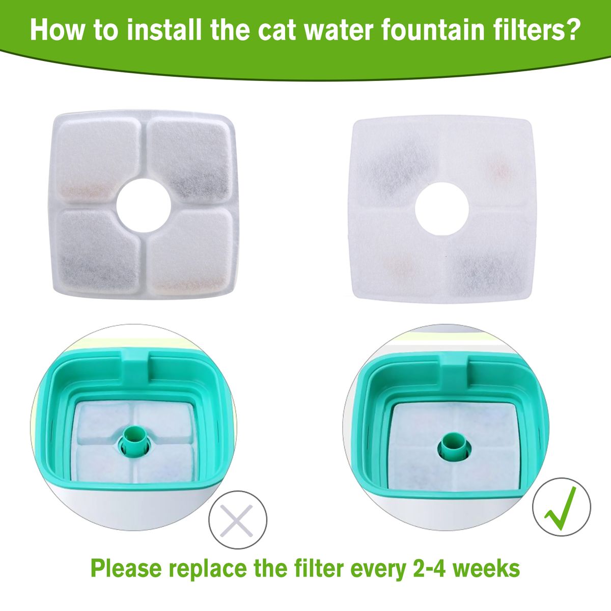 How to Use: Rinse the filter with water thoroughly before using it, easy to mount it on the pet water fountain. In order to ensure the water clean, the filter should be replaced in time, please replace them every 2-4 weeks.