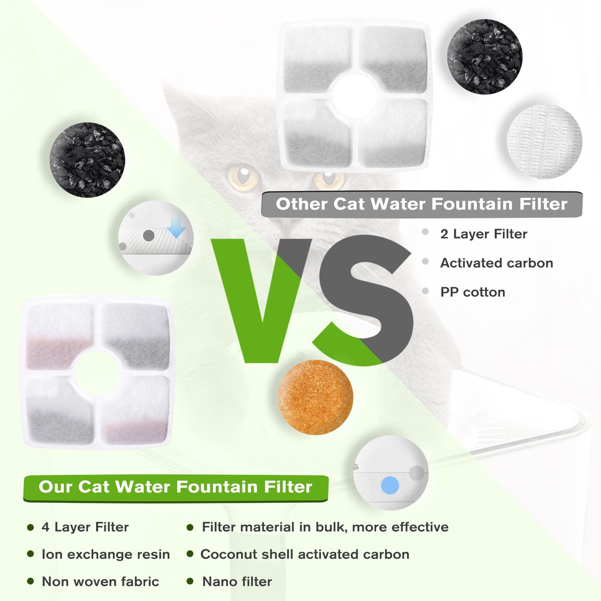 Replacement filter for cat fountain. Keep your cat's drinking water is fresh, clean and safe. Helping you to take care of your cat's health. Most of the filters in the market are made of activated carbon. But these filters are made of coconut shell activated carbon, ion exchange resin, high density non woven fabric. The water is deeply purified and safer.