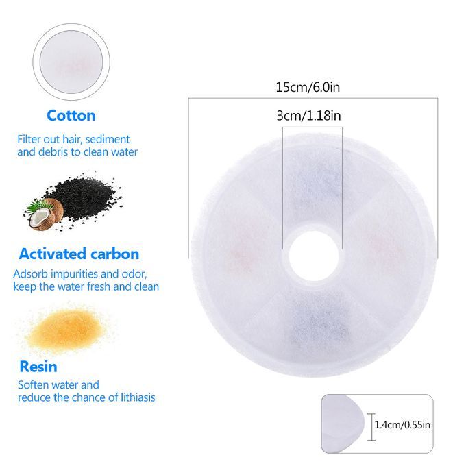 Replacement filter for cat fountain. Keep your cat's drinking water is fresh, clean and safe. Helping you to take care of your cat's health. Most of the filters in the market are made of activated carbon. But this filters are made of high quality activated carbon, resin and cotton mesh. The water is deeply purified and safer.