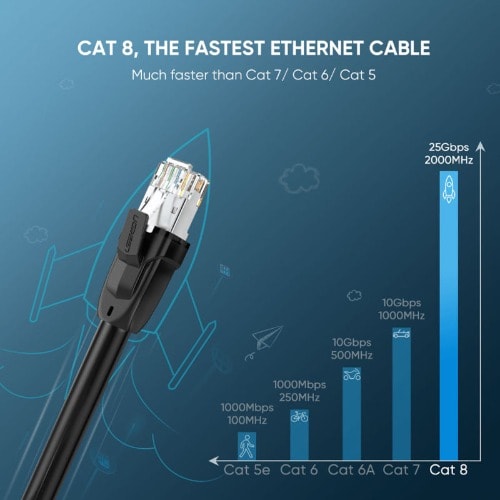 Cat 8 Ethernet Cable supports bandwidth up to 2000MHz and 40Gbps data transmission speed, ensuring stable network speed for you to online gaming, surf the Internet, online HD video streaming, upload, download, and more.