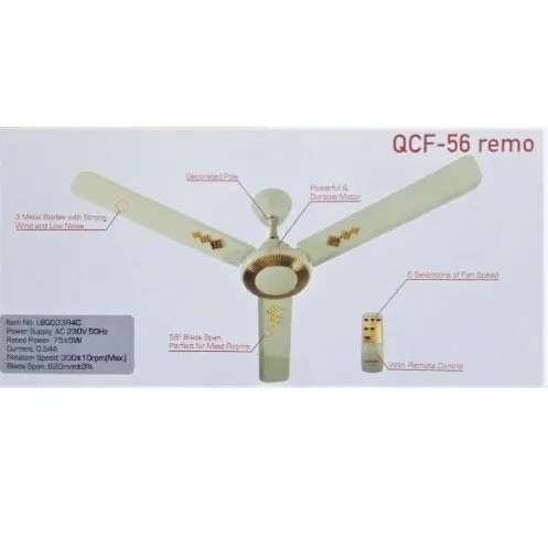 QCF-24H is a metallic non-rustable and non-corrosive frame with metallic 24 inches fan blades that can stand the test of time and in whatever whether condition. You can use at home, ceremonies, factories, clubs, and wherever cooling and ventilation is required. This product is a must for everyone.This fan is purely electricity driven, non DC base and non rechargeable. Can fit easily in any space on the ceiling.