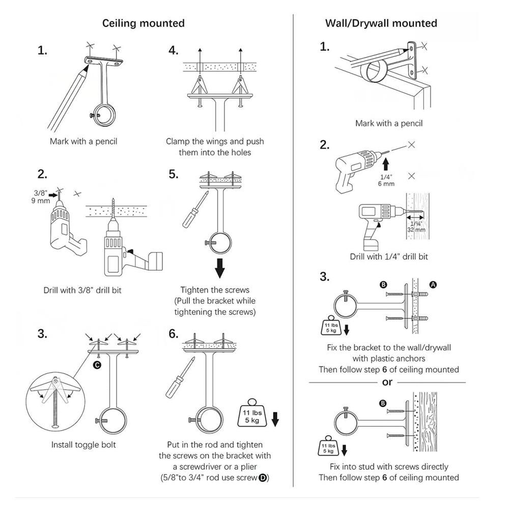 Easy To Install First Drill Holes On The Mounting Surface Secondly Knock The Plastic Expansion Pipes Into The Hole And Tighten The Bottom Plate With The Screw Finally Insert The Rod To Be Supported Into The Rod Holder And Make It Is On The Same Level