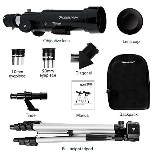 Details: Designed with Amerian innovation for beginner stargazers, the Celestron Travel Sope is a professionally engineered refrator telesope that is perfet for elestial or terrestrial viewing on the go. Its the perfet telesope for adults and kids to use together with its fully-oated, high-quality gl optis, inluding a refrator-style mm objetive lens. The aperture allows high-resolution viewing, without adding a lot of extra weight. Added oating on the mm lens allows light to enter, providing sharper, risper viewing of elestial and terrestrial objets during the day or at night.The Celestron telesope for beginners is designed with several operating features that make it exeptionally user-friendly. Our preision manufaturing standards and high-quality materials are unmathed in the industry. Weve inluded two quality eyepiees (20mm and 10mm) and a star diagonal for risp low- and high-power viewing during the day or at night, allowing you to enjoy lose-ups of wildlife in nature or stargaze with family and friends.The Celestron Travel Sope weighs just 3.3 pounds and embles in seonds with no tools required. Its easy to use to navigate the sky. When your observing session is over, everything paks up into the handy inluded traveling bakpak.Your purhase also entitles you to a FREE download of Celestrons BONUS Starry Night Astronomy Software with information on thousands of elestial objets, printable sky maps, and more. Its the best way to learn about the night sky and plan your next observing session.