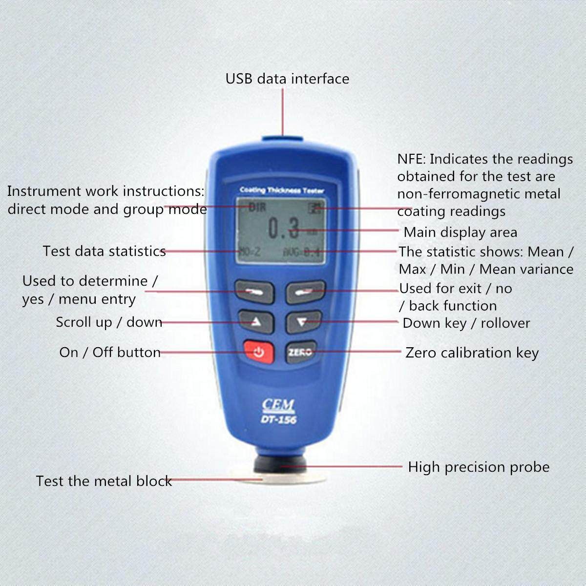 2x AAA Batteries Sensing probe Ferromagnetism Non-ferromagnetic Working principle Magnetic induction Measuring range 0 ~ 1250um 0 ~ 1250um Accuracy ± 3% + 1um ± 3% + 1.5um Resolution 0.1um 0.1um Minimum radius of curvature 1.5mm 3mm Minimum measuring area (diameter) 7mm 5mm Can measure the minimum basic area 0.5mm 0.3mm