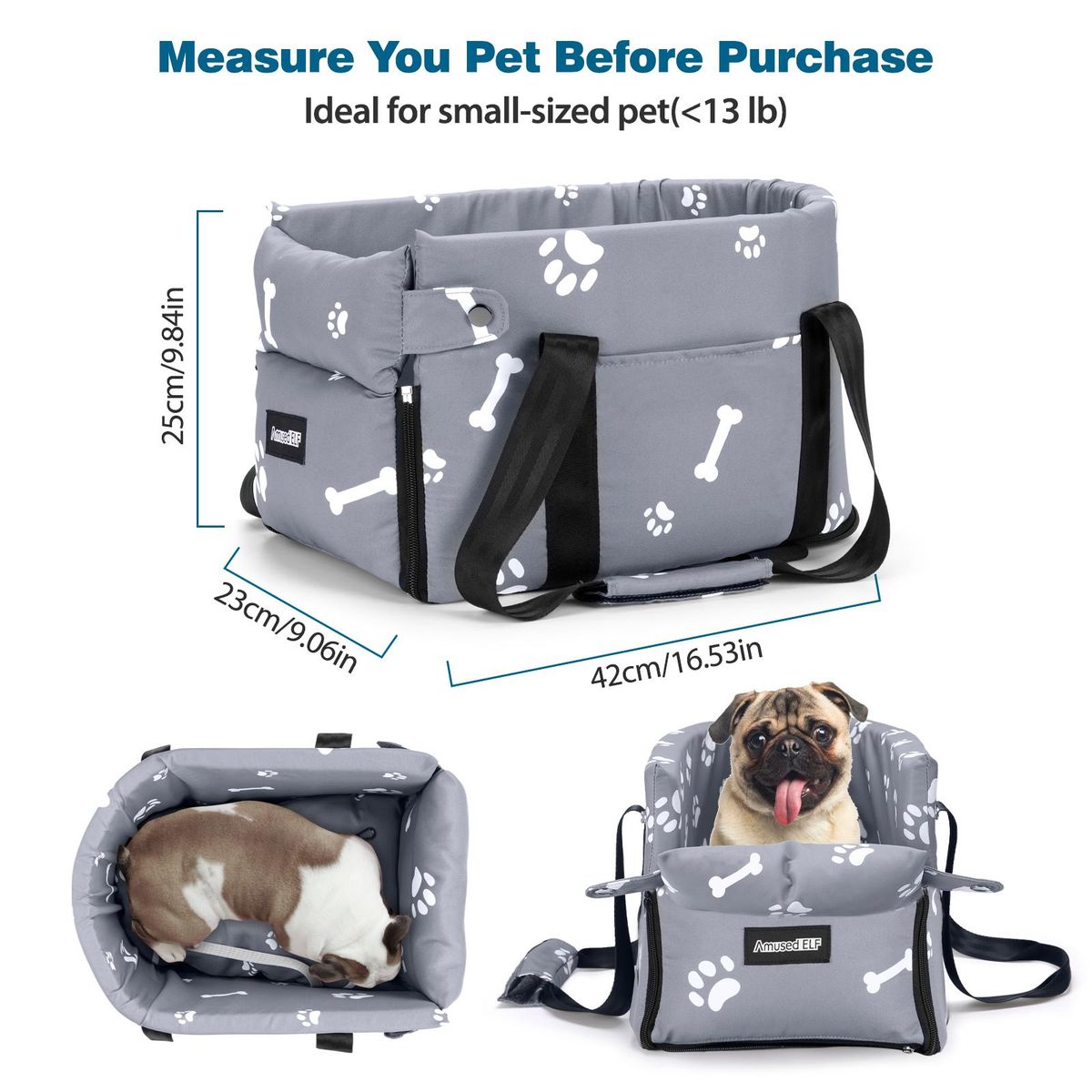 【Check the Size】External Dimensions:17.7in* 8.6in * 9in, Dog with back length less than 35.5cm and weight less than 5.5kg(12lb), or cat less than 6kg (13.3lb). At meanwhile, with our pet car seat, the car space will no longer be occupied